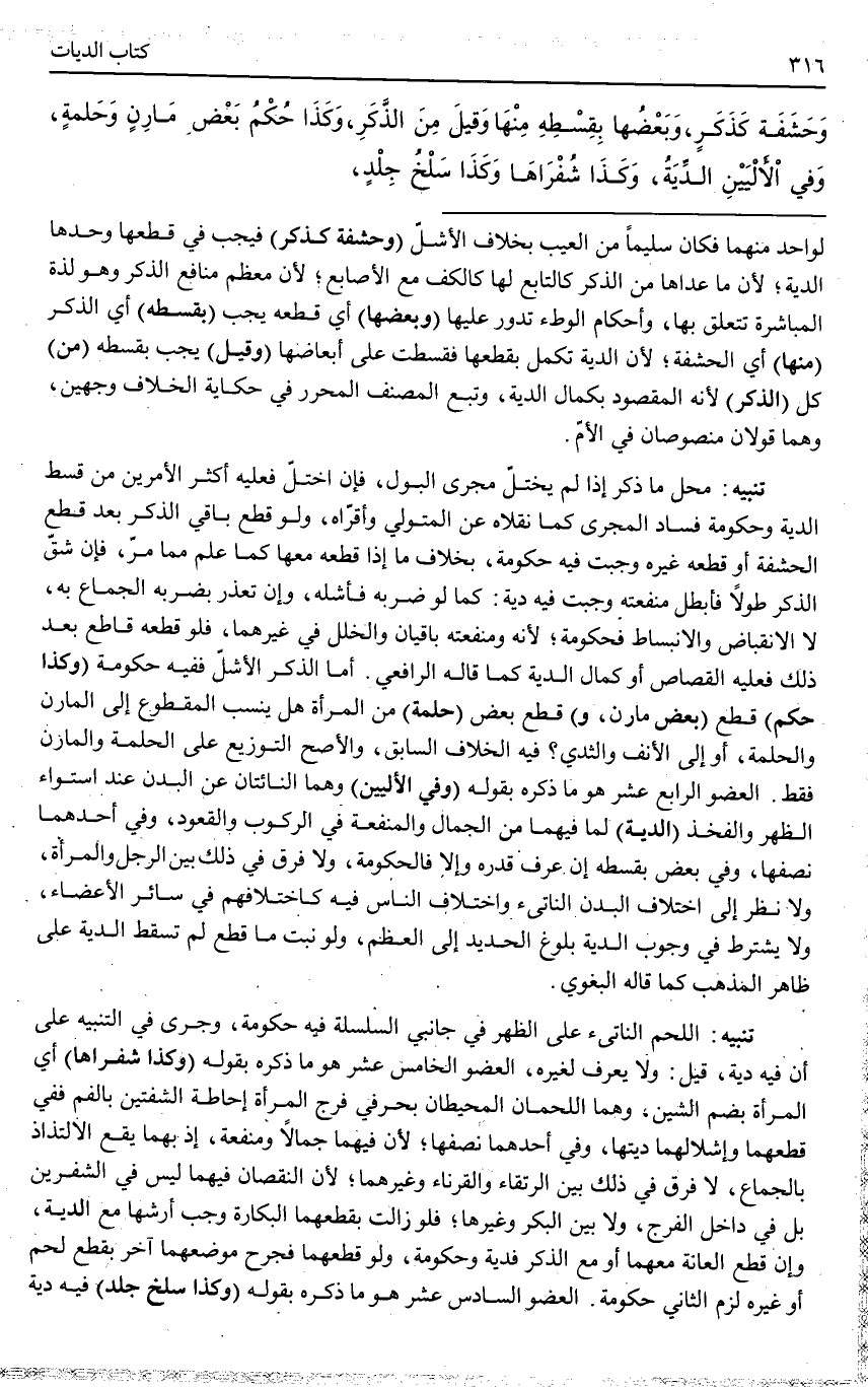 الْعُضْوُ الرَّابِعَ عَشَرَ: هُوَ مَا ذَكَرَهُ بِقَوْلِهِ (وَفِي الْأَلْيَيْنِ) وَهُمَا النَّاتِئَانِ عَنْ الْبَدَنِ عِنْدَ اسْتِوَاءِ الظَّهْرِ وَالْفَخِذِ (الدِّيَةُ) لِمَا فِيهِمَا مِنْ الْجَمَالِ وَالْمَنْفَعَةِ فِي الرُّكُوبِ وَالْقُعُودِ، وَفِي أَحَدِهِمَا نِصْفُهَا، وَفِي بَعْضٍ بِقِسْطِهِ إنْ عُرِفَ قَدْرُهُ وَإِلَّا فَالْحُكُومَةُ، وَلَا فَرْقَ فِي ذَلِكَ بَيْنَ الرَّجُلِ وَالْمَرْأَةِ، وَلَا نَظَرَ إلَى اخْتِلَافِ الْبَدَنِ النَّاتِئِ، وَاخْتِلَافُ النَّاسِ فِيهِ كَاخْتِلَافِهِمْ فِي سَائِرِ الْأَعْضَاءِ، وَلَا يُشْتَرَطُ فِي وُجُوبِ الدِّيَةِ بُلُوغُ الْحَدِيدِ إلَى الْعَظْمِ، وَلَوْ نَبَتَ مَا قُطِعَ لَمْ تَسْقُطْ الدِّيَةُ عَلَى ظَاهِرِ الْمَذْهَبِ كَمَا قَالَ الْبَغَوِيّ.