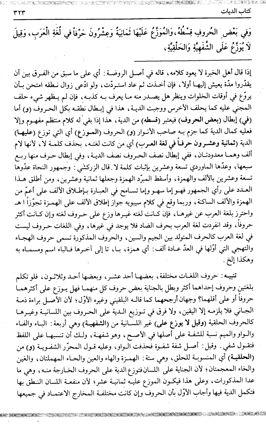 ـــــــــــــــــــــــــــــQإذَا قَالَ أَهْلُ الْخِبْرَةِ لَا يَعُودُ كَلَامُهُ، قَالَهُ فِي أَصْلِ الرَّوْضَةِ: أَيْ عَلَى مَا سَبَقَ مِنْ الْفَرْقِ بَيْنَ أَنْ يُقَدِّرُوا مُدَّةً يَعِيشُ إلَيْهَا أَوْ لَا، فَإِنْ أُخِذَتْ ثُمَّ عَادَ اُسْتُرِدَّتْ، وَلَوْ ادَّعَى زَوَالَ نُطْقِهِ اُمْتُحِنَ بِأَنْ يُرَوَّعَ فِي أَوْقَاتِ الْخَلَوَاتِ وَيُنْظَرَ هَلْ يَصْدُرُ مِنْهُ مَا يُعْرَفُ بِهِ كَذِبُهُ، فَإِنْ لَمْ يَظْهَرْ شَيْءٌ حُلِّفَ الْمَجْنِيُّ عَلَيْهِ كَمَا يُحَلَّفُ الْأَخْرَسُ وَوَجَبَتْ الدِّيَةُ، هَذَا فِي إبْطَالِ نُطْقِهِ بِكُلِّ الْحُرُوفِ (وَ) أَمَّا (فِي) إبْطَالِ (بَعْضِ الْحُرُوفِ) فَيُعْتَبَرُ (قِسْطُهُ) مِنْ الدِّيَةِ، هَذَا إذَا بَقِيَ لَهُ كَلَامٌ مُنْتَظِمٌ مَفْهُومٌ وَإِلَّا فَعَلَيْهِ كَمَالُ الدِّيَةِ كَمَا جَزَمَ بِهِ صَاحِبُ الْأَنْوَارِ (وَ) الْحُرُوفُ (الْمُوَزَّعُ) أَيْ الَّتِي تُوَزَّعُ (عَلَيْهَا) الدِّيَةُ (ثَمَانِيَةٌ وَعِشْرُونَ حَرْفًا فِي لُغَةِ الْعَرَبِ) أَيْ مَنْ كَانَتْ لُغَتَهُ، بِحَذْفِ كَلِمَةِ لَا؛ لِأَنَّهَا لَامٌ أَلِفٌ وَهُمَا مَعْدُودَتَانِ، فَفِي إبْطَالِ نِصْفِ الْحُرُوفِ نِصْفُ الدِّيَةِ، وَفِي إبْطَالِ حَرْفٍ مِنْهَا رُبْعُ سُبْعِهَا، وَعَدَّهَا الْمَاوَرْدِيُّ تِسْعَةً وَعِشْرِينَ بِإِثْبَاتِ كَلِمَةِ لَا. قَالَ الزَّرْكَشِيُّ: وَجُمْهُورُ النُّحَاةِ عَدُّوهَا تِسْعَةً وَعِشْرِينَ بِالْأَلِفِ وَالْهَمْزَةِ، وَأَسْقَطَ الْمُبَرِّدُ الْهَمْزَةَ وَجَعَلَهَا ثَمَانِيَةً وَعِشْرِينَ، وَمَنْ أَطْلَقَ هَذَا الْعَدَدَ عَلَى رَأْيِ الْجُمْهُورِ فَهُوَ إمَّا سَهْوٌ وَإِمَّا تَسَامُحٌ فِي الْعِبَارَةِ بِإِطْلَاقِ الْأَلِفِ عَلَى أَعَمَّ مِنْ الْهَمْزَةِ وَالْأَلِفِ السَّاكِنَةِ، وَرُبَّمَا وَقَعَ فِي كَلَامِ سِيبَوَيْهِ جَوَازُ إطْلَاقِ الْأَلِفِ عَلَى الْهَمْزَةِ تَجَوُّزًا اهـ.