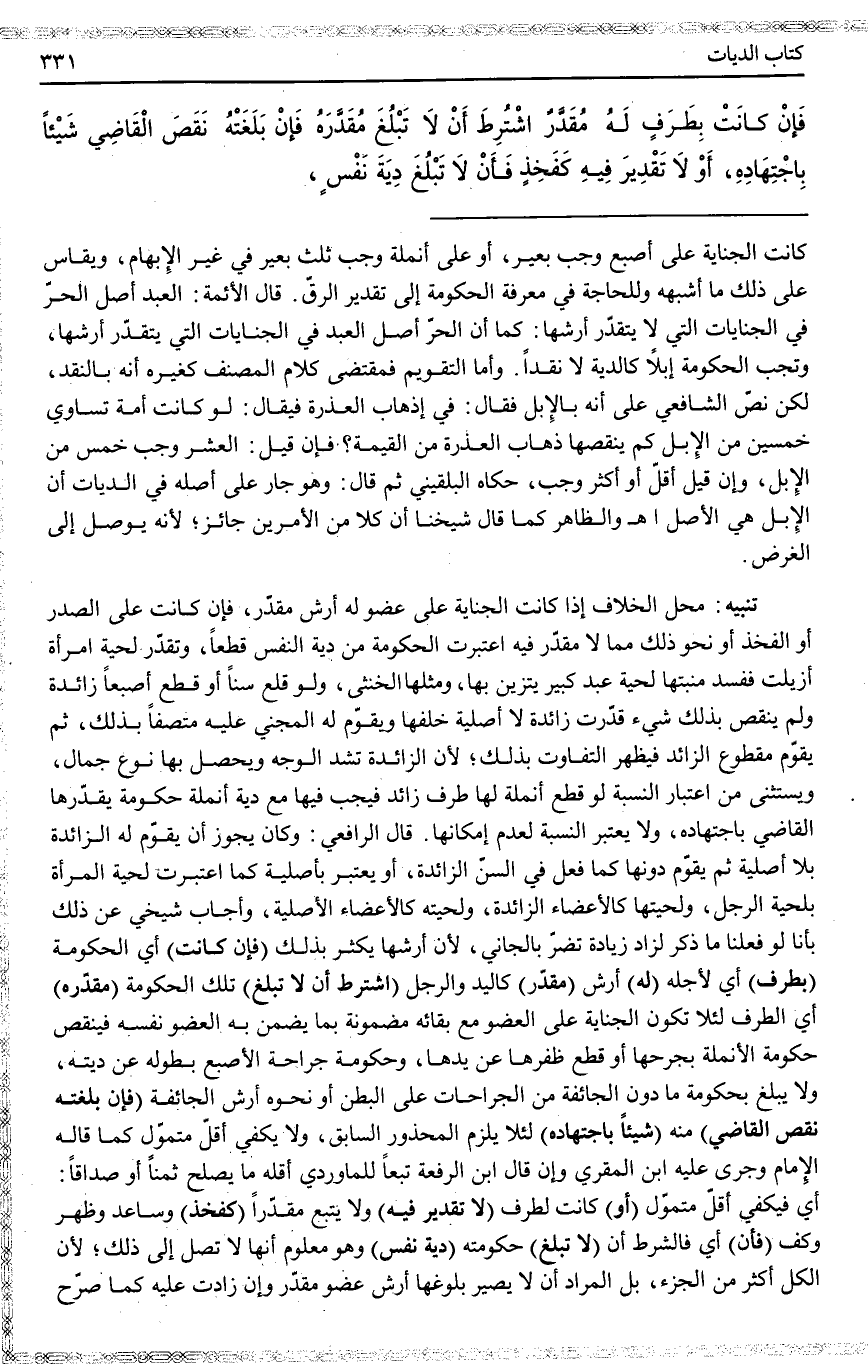 ـــــــــــــــــــــــــــــQكَانَتْ الْجِنَايَةُ عَلَى أُصْبُعٍ وَجَبَ بَعِيرٌ، أَوْ عَلَى أُنْمُلَةٍ وَجَبَ ثُلُثُ بَعِيرٍ فِي غَيْرِ الْإِبْهَامِ، وَيُقَاسُ عَلَى ذَلِكَ مَا أَشْبَهَهُ وَلِلْحَاجَةِ فِي مَعْرِفَةِ الْحُكُومَةِ إلَى تَقْدِيرِ الرِّقِّ. قَالَ الْأَئِمَّةُ: الْعَبْدُ أَصْلُ الْحُرِّ فِي الْجِنَايَاتِ الَّتِي لَا يَتَقَدَّرُ أَرْشُهَا: كَمَا أَنَّ الْحُرَّ أَصْلُ الْعَبْدِ فِي الْجِنَايَاتِ الَّتِي يَتَقَدَّرُ أَرْشُهَا، وَتَجِبُ الْحُكُومَةُ إبِلًا كَالدِّيَةِ لَا نَقْدًا. وَأَمَّا التَّقْوِيمُ فَمُقْتَضَى كَلَامِ الْمُصَنِّفِ كَغَيْرِهِ أَنَّهُ بِالنَّقْدِ، لَكِنْ نَصَّ الشَّافِعِيُّ عَلَى أَنَّهُ بِالْإِبِلِ فَقَالَ: فِي إذْهَابِ الْعُذْرَةِ فَيُقَالُ: لَوْ كَانَتْ أَمَةً تُسَاوِي خَمْسِينَ مِنْ الْإِبِلِ كَمْ يُنْقِصُهَا ذَهَابُ الْعُذْرَةِ مِنْ الْقِيمَةِ؟ فَإِنْ قِيلَ: الْعُشْرُ وَجَبَ خَمْسٌ مِنْ الْإِبِلِ، وَإِنْ قِيلَ أَقَلُّ أَوْ أَكْثَرُ وَجَبَ، حَكَاهُ الْبُلْقِينِيُّ ثُمَّ قَالَ: وَهُوَ جَارٍ عَلَى أَصْلِهِ فِي الدِّيَاتِ أَنَّ الْإِبِلَ هِيَ الْأَصْلُ اهـ.