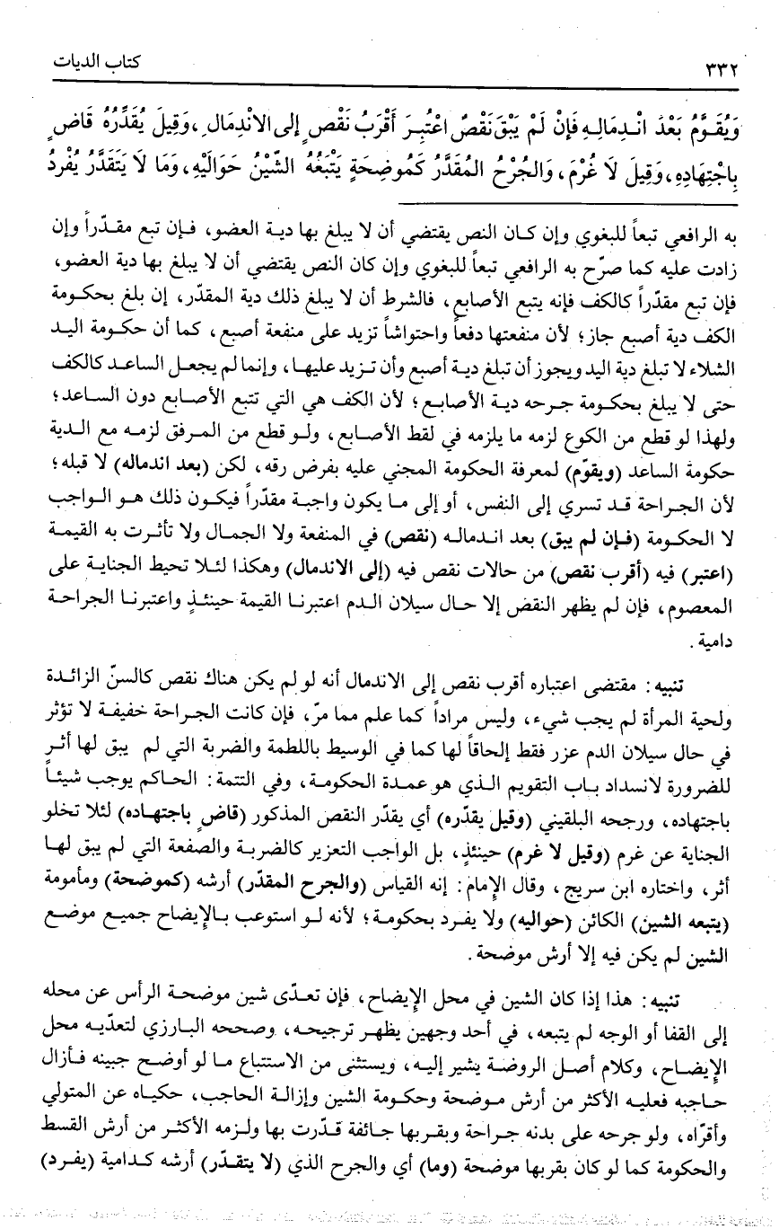 ـــــــــــــــــــــــــــــQبِهِ الرَّافِعِيُّ تَبَعًا لِلْبَغَوِيِّ وَإِنْ كَانَ النَّصُّ يَقْتَضِي أَنْ لَا يَبْلُغَ بِهَا دِيَةَ الْعُضْوِ، فَإِنْ تَبِعَ مُقَدَّرًا وَإِنْ زَادَتْ عَلَيْهِ كَمَا صَرَّحَ بِهِ الرَّافِعِيُّ تَبَعًا لِلْبَغَوِيِّ وَإِنْ كَانَ النَّصُّ يَقْتَضِي أَنْ لَا يَبْلُغَ بِهَا دِيَةَ الْعُضْوِ، فَإِنْ تَبِعَ مُقَدَّرًا كَالْكَفِّ فَإِنَّهُ يَتْبَعُ الْأَصَابِعَ، فَالشَّرْطُ أَنْ لَا يَبْلُغَ ذَلِكَ دِيَةَ الْمُقَدَّرِ، إنْ بَلَغَ بِحُكُومَةِ الْكَفِّ دِيَةَ أُصْبُعٍ جَازَ؛ لِأَنَّ مَنْفَعَتَهَا دَفْعًا وَاحْتِوَاشًا تَزِيدُ عَلَى مَنْفَعَةِ أُصْبُعٍ، كَمَا أَنَّ حُكُومَةَ الْيَدِ الشَّلَّاءِ لَا تَبْلُغُ دِيَةَ الْيَدِ وَيَجُوزُ أَنْ تَبْلُغَ دِيَةَ أُصْبُعٍ وَأَنْ تَزِيدَ عَلَيْهَا، وَإِنَّمَا لَمْ يَجْعَلْ السَّاعِدَ كَالْكَفِّ حَتَّى لَا يَبْلُغَ بِحُكُومَةِ جُرْحِهِ دِيَةَ الْأَصَابِعِ؛ لِأَنَّ الْكَفَّ هِيَ الَّتِي تَتْبَعُ الْأَصَابِعَ دُونَ السَّاعِدِ؛ وَلِهَذَا لَوْ قَطَعَ مِنْ الْكُوعِ لَزِمَهُ مَا يَلْزَمُهُ فِي لَقْطِ الْأَصَابِعِ، وَلَوْ قَطَعَ مِنْ الْمَرْفِقِ لَزِمَهُ مَعَ الدِّيَةِ حُكُومَةُ السَّاعِدِ (وَيُقَوَّمُ) لِمَعْرِفَةِ الْحُكُومَةِ الْمَجْنِيُّ عَلَيْهِ بِفَرْضِ رِقِّهِ، لَكِنْ (بَعْدَ انْدِمَالِهِ) لَا قَبْلَهُ؛ لِأَنَّ الْجِرَاحَةَ قَدْ تَسْرِي إلَى النَّفْسِ، أَوْ إلَى مَا يَكُونُ وَاجِبُهُ مُقَدَّرًا فَيَكُونُ ذَلِكَ هُوَ الْوَاجِبُ لَا الْحُكُومَةُ (فَإِنْ لَمْ يَبْقَ) بَعْدَ انْدِمَالِهِ (نَقْصٌ) فِي الْمَنْفَعَةِ وَلَا الْجَمَالِ وَلَا تَأَثَّرَتْ بِهِ الْقِيمَةُ (اُعْتُبِرَ) فِيهِ (أَقْرَبُ نَقْصٍ) مِنْ حَالَاتِ نَقْصٍ فِيهِ (إلَى الِانْدِمَالِ) وَهَكَذَا لِئَلَّا تُحِيطَ الْجِنَايَةُ عَلَى الْمَعْصُومِ، فَإِنْ لَمْ يَظْهَرْ النَّقْصُ إلَّا حَالَ سَيَلَانِ الدَّمِ اعْتَبَرْنَا الْقِيمَةَ حِينَئِذٍ وَاعْتَبَرْنَا الْجِرَاحَةَ دَامِيَةً.
