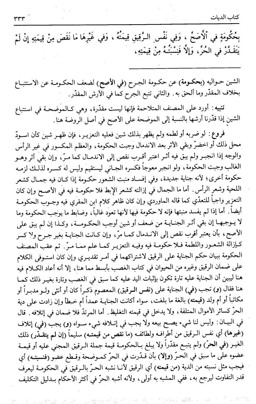 فُرُوعٌ: لَوْ ضَرَبَهُ أَوْ لَطَمَهُ وَلَمْ يَظْهَرْ بِذَلِكَ شَيْنٌ فَعَلَيْهِ التَّعْزِيرُ، فَإِنْ ظَهَرَ شَيْنٌ كَأَنْ اسْوَدَّ مَحَلُّ ذَلِكَ أَوْ اخْضَرَّ وَبَقِيَ الْأَثَرُ بَعْدَ الِانْدِمَالِ وَجَبَتْ الْحُكُومَةُ، وَالْعَظْمُ الْمَكْسُورُ فِي غَيْرِ الرَّأْسِ وَالْوَجْهِ إذَا انْجَبَرَ وَلَمْ يَبْقَ فِيهِ أَثَرٌ اُعْتُبِرَ أَقْرَبُ نَقْصٍ إلَى الِانْدِمَالِ كَمَا مَرَّ، وَإِنْ بَقِيَ أَثَرٌ وَهُوَ الْغَالِبُ وَجَبَتْ الْحُكُومَةُ، وَلَوْ انْجَبَرَ مُعْوَجًّا فَكَسَرَهُ الْجَانِي لِيَسْتَقِيمَ وَلَيْسَ لَهُ كَسْرُهُ لِذَلِكَ لَزِمَهُ حُكُومَةٌ أُخْرَى؛ لِأَنَّهُ جِنَايَةٌ جَدِيدَةٌ، وَفِي إفْسَادِ مَنْبَتِ الشُّعُورِ حُكُومَةٌ إذَا كَانَ فِيهِ جَمَالٌ كَشَعْرِ اللِّحْيَةِ وَشَعْرِ الرَّأْسِ. أَمَّا مَا الْجَمَالُ فِي إزَالَتِهِ كَشَعْرِ الْإِبِطِ فَلَا حُكُومَةَ فِيهِ فِي الْأَصَحِّ وَإِنْ كَانَ التَّعْزِيرُ وَاجِبًا لِلتَّعَدِّي كَمَا قَالَهُ الْمَاوَرْدِيُّ وَإِنْ كَانَ ظَاهِرُ كَلَامِ ابْنِ الْمُقْرِي فِيهِ وُجُوبَ الْحُكُومَةِ أَيْضًا. أَمَّا إذَا لَمْ يَفْسُدْ مَنْبَتُهَا فَإِنَّهُ لَا حُكُومَةَ فِيهَا لِأَنَّهَا تَعُودُ غَالِبًا، وَضَابِطُ مَا يُوجِبُ الْحُكُومَةَ وَمَا لَا يُوجِبُهَا إنْ بَقِيَ أَثَرُ الْجِنَايَةِ مِنْ ضَعْفٍ أَوْ شَيْنٍ أَوْجَبَ الْحُكُومَةَ، وَكَذَا إنْ لَمْ يَبْقَ عَلَى الْأَصَحِّ، بِأَنْ يُعْتَبَرَ أَقْرَبُ نَقْصٍ إلَى الِانْدِمَالِ كَمَا مَرَّ، وَإِنْ كَانَتْ الْجِنَايَةُ بِغَيْرِ جُرْحٍ وَلَا كَسْرٍ كَإِزَالَةِ الشُّعُورِ وَاللَّطْمَةِ فَلَا حُكُومَةَ فِيهِ وَفِيهِ التَّعْزِيرُ كَمَا عُلِمَ مِمَّا مَرَّ. ثُمَّ عَقَّبَ الْمُصَنِّفُ الْحُكُومَةَ بِبَيَانِ حُكْمِ الْجِنَايَةِ عَلَى الرَّقِيقِ لِاشْتِرَاكِهِمَا فِي أَمْرٍ تَقْدِيرِيٍّ وَإِنْ كَانَ اسْتَوْفَى الْكَلَامَ عَلَى ضَمَانِ الرَّقِيقِ وَغَيْرِهِ مِنْ الْحَيَوَانِ فِي كِتَابِ الْغَصْبِ بِأَبْسَطِ مِمَّا هُنَا، إلَّا أَنَّهُ أَعَادَ الْكَلَامَ فِيهِ هُنَا لِيُبَيِّنَ أَنَّ الْجِنَايَةَ عَلَيْهِ تَارَةً تَكُونُ بِإِثْبَاتِ الْيَدِ عَلَيْهِ كَمَا سَبَقَ فِي الْغَصْبِ وَتَارَةً بِغَيْرِ ذَلِكَ كَمَا هُنَا.