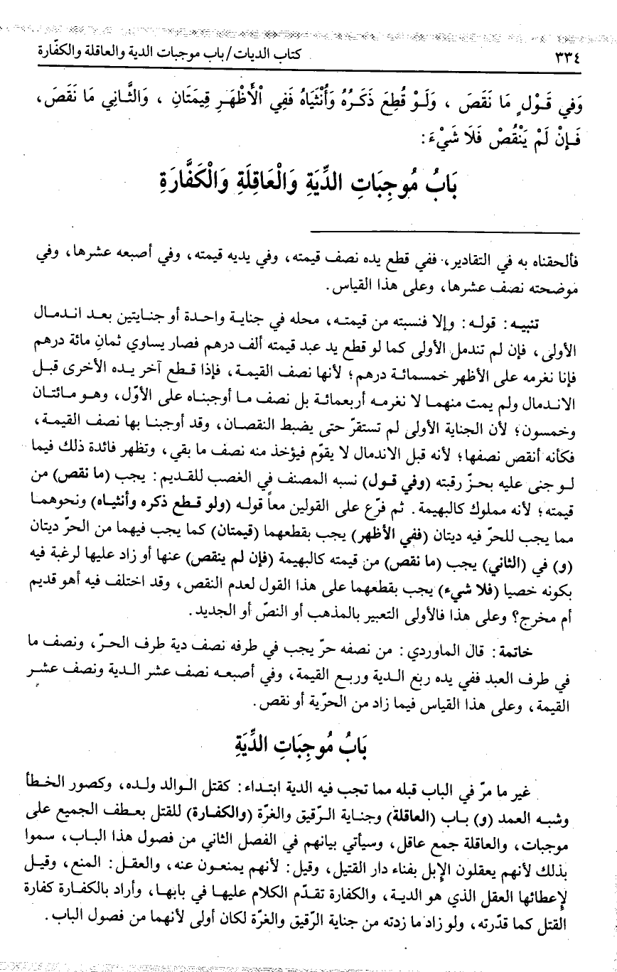 بَابُ مُوجِبَاتِ الدِّيَةِ غَيْرَ مَا مَرَّ فِي الْبَابِ قَبْلَهُ مِمَّا تَجِبُ فِيهِ الدِّيَةُ ابْتِدَاءً: كَقَتْلِ الْوَالِدِ وَلَدَهُ، وَكَصُوَرِ الْخَطَأِ وَشِبْهِ الْعَمْدِ (وَ) بَابُ (الْعَاقِلَةِ) وَجِنَايَةِ الرَّقِيقِ وَالْغُرَّةِ (وَالْكَفَّارَةِ) لِلْقَتْلِ بِعَطْفِ الْجَمِيعِ عَلَى مُوجِبَاتِ، وَالْعَاقِلَةُ جَمْعُ عَاقِلٍ، وَسَيَأْتِي بَيَانُهُمْ فِي الْفَصْلِ الثَّانِي مِنْ فُصُولِ هَذَا الْبَابِ، سُمُّوا بِذَلِكَ لِأَنَّهُمْ يَعْقِلُونَ الْإِبِلَ بِفِنَاءِ دَارِ الْقَتِيلِ، وَقِيلَ: لِأَنَّهُمْ يَمْنَعُونَ عَنْهُ، وَالْعَقْلُ: الْمَنْعُ، وَقِيلَ لِإِعْطَائِهَا الْعَقْلَ الَّذِي هُوَ الدِّيَةُ، وَالْكَفَّارَةُ تَقَدَّمَ الْكَلَامُ عَلَيْهَا فِي بَابِهَا، وَأَرَادَ بِالْكَفَّارَةِ كَفَّارَةَ الْقَتْلِ كَمَا قَدَّرْتُهُ، وَلَوْ زَادَ مَا زِدْتُهُ مِنْ جِنَايَةِ الرَّقِيقِ وَالْغُرَّةِ لَكَانَ أَوْلَى لِأَنَّهُمَا مِنْ فُصُولِ الْبَابِ.