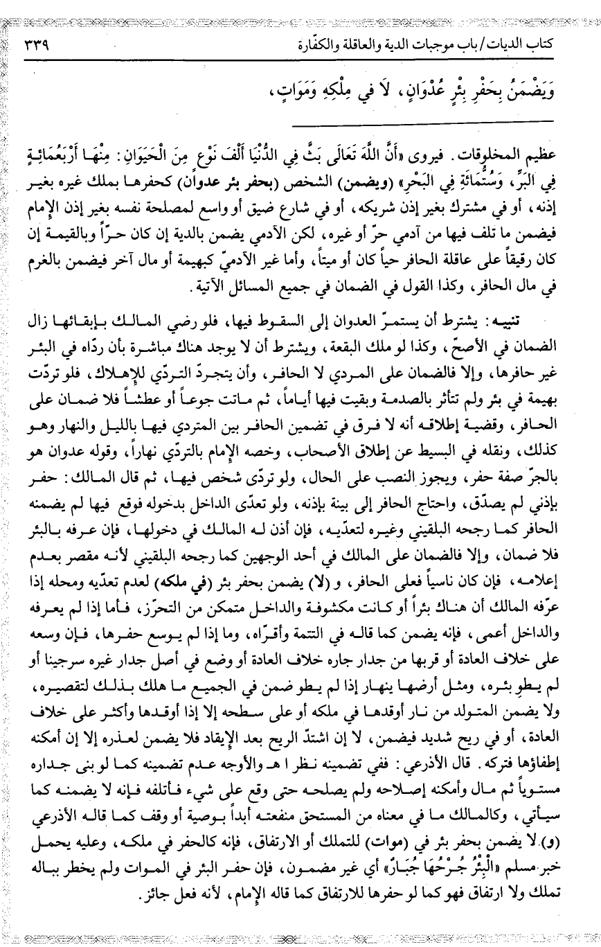 (وَيَضْمَنُ) الشَّخْصُ (بِحَفْرِ بِئْرٍ عُدْوَانٍ) كَحَفْرِهَا بِمِلْكِ غَيْرِهِ بِغَيْرِ إذْنِهِ، أَوْ فِي مُشْتَرَكٍ بِغَيْرِ إذْنِ شَرِيكِهِ، أَوْ فِي شَارِعٍ ضَيِّقٍ أَوْ وَاسِعٍ لِمَصْلَحَةِ نَفْسِهِ بِغَيْرِ إذْنٍ فَيَضْمَنُ مَا تَلِفَ فِيهَا مِنْ آدَمِيٍّ حُرٍّ أَوْ غَيْرِهِ، لَكِنَّ الْآدَمِيَّ يُضْمَنُ بِالدِّيَةِ إنْ كَانَ حُرًّا وَبِالْقِيمَةِ إنْ كَانَ رَقِيقًا عَلَى عَاقِلَةِ الْحَافِرِ حَيًّا كَانَ أَوْ مَيِّتًا، وَأَمَّا غَيْرُ الْآدَمِيِّ كَبَهِيمَةٍ أَوْ مَالِ آخَرَ فَيُضْمَنُ بِالْغُرْمِ فِي مَالِ الْحَافِرِ، وَكَذَا الْقَوْلُ فِي الضَّمَانِ فِي جَمِيعِ الْمَسَائِلِ الْآتِيَةِ.