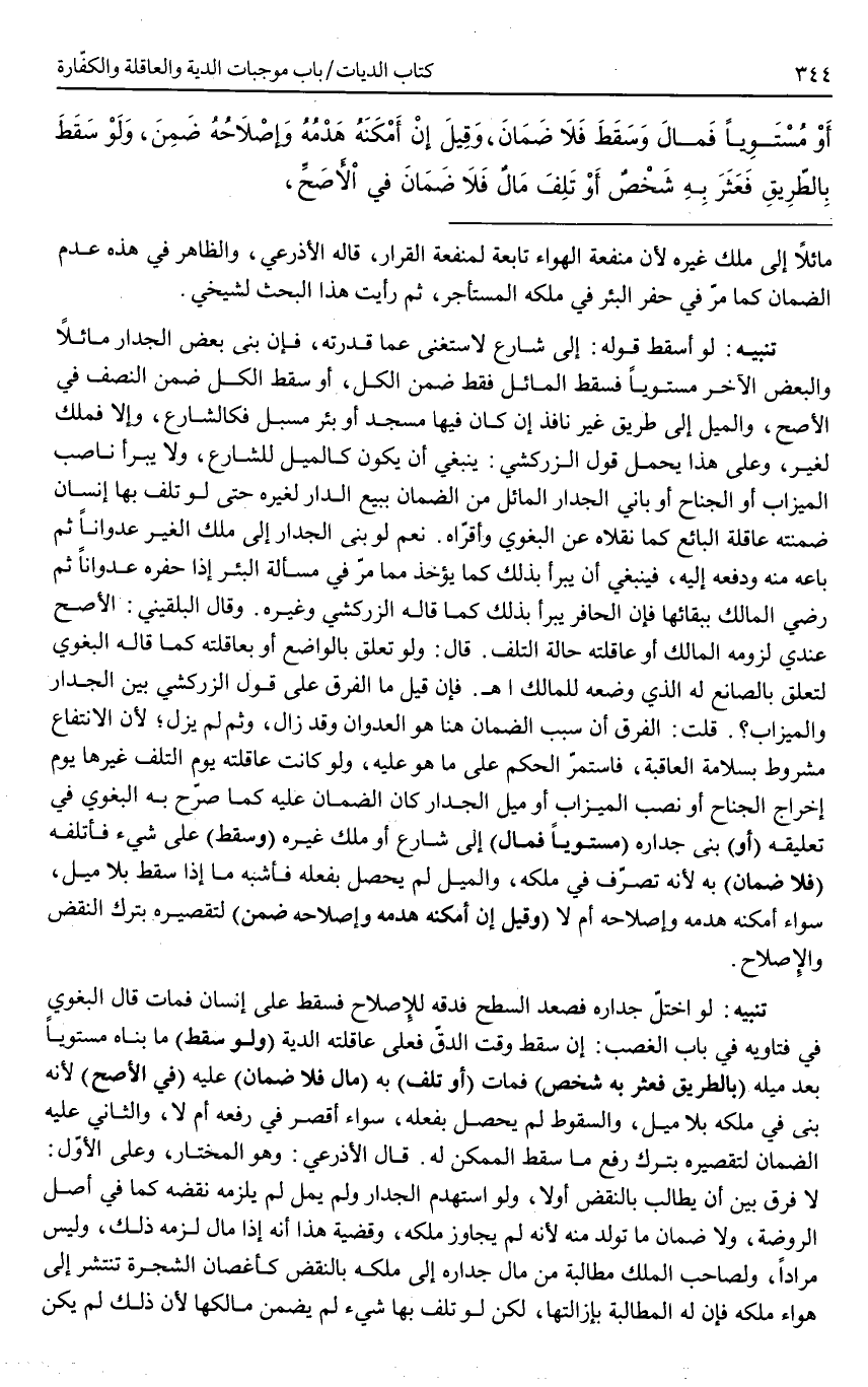 تَنْبِيهٌ: لَوْ اخْتَلَّ جِدَارُهُ فَصَعَدَ السَّطْحَ فَدَقَّهُ لِلْإِصْلَاحِ فَسَقَطَ عَلَى إنْسَانٍ فَمَاتَ قَالَ الْبَغَوِيّ فِي فَتَاوِيهِ فِي بَابِ الْغَصْبِ: إنْ سَقَطَ وَقْتَ الدَّقِّ فَعَلَى عَاقِلَتِهِ الدِّيَةُ (وَلَوْ سَقَطَ) مَا بَنَاهُ مُسْتَوِيًا بَعْدَ مَيْلِهِ (بِالطَّرِيقِ فَعَثَرَ بِهِ شَخْصٌ) فَمَاتَ (أَوْ تَلِفَ) بِهِ (مَالٌ فَلَا ضَمَانَ) عَلَيْهِ (فِي الْأَصَحِّ) لِأَنَّهُ بَنَى فِي مِلْكِهِ بِلَا مَيْلٍ، وَالسُّقُوطُ لَمْ يَحْصُلُ بِفِعْلِهِ، سَوَاءٌ أَقَصَّرَ فِي رَفْعِهِ أَمْ لَا، وَالثَّانِي عَلَيْهِ الضَّمَانُ لِتَقْصِيرِهِ بِتَرْكِ رَفْعِ مَا سَقَطَ الْمُمْكِنُ لَهُ. قَالَ الْأَذْرَعِيُّ: وَهُوَ الْمُخْتَارُ، وَعَلَى الْأَوَّلِ: لَا فَرْقَ بَيْنَ أَنْ يُطَالَبَ بِالنَّقْضِ أَوْ لَا، وَلَوْ اسْتُهْدِمَ الْجِدَارُ وَلَمْ يَمِلْ لَمْ يَلْزَمْهُ نَقْضُهُ كَمَا فِي أَصْلِ الرَّوْضَةِ، وَلَا ضَمَانُ مَا تَوَلَّدَ مِنْهُ لِأَنَّهُ لَمْ يُجَاوِزْ مِلْكَهُ، وَقَضِيَّةُ هَذَا أَنَّهُ إذَا مَالَ لَزِمَهُ ذَلِكَ، وَلَيْسَ مُرَادًا، وَلِصَاحِبِ الْمِلْكِ مُطَالَبَةُ مَنْ مَالَ جِدَارُهُ إلَى مِلْكِهِ بِالنَّقْضِ كَأَغْصَانِ الشَّجَرَةِ تَنْتَشِرُ إلَى هَوَاءِ مِلْكِهِ فَإِنَّ لَهُ الْمُطَالَبَةَ بِإِزَالَتِهَا، لَكِنْ لَوْ تَلِفَ بِهَا شَيْءٌ لَمْ يَضْمَنْ مَالِكُهَا لِأَنَّ ذَلِكَ لَمْ يَكُنْ