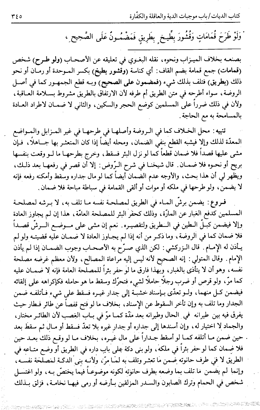 (وَلَوْ طَرَحَ) شَخْصٌ (قُمَامَاتٍ) جَمْعُ قُمَامَةٍ بِضَمِّ الْقَافِ: أَيْ كُنَاسَةً (وَقُشُورَ بِطِّيخٍ) بِكَسْرِ الْمُوَحَّدَةِ أَوْ رُمَّانٍ أَوْ نَحْوَ ذَلِكَ (بِطَرِيقٍ) فَتَلِفَ بِذَلِكَ شَيْءٌ (فَمَضْمُونٌ عَلَى الصَّحِيحِ) وَبِهِ قَطَعَ الْجُمْهُورُ كَمَا فِي أَصْلِ الرَّوْضَةِ، سَوَاءٌ أَطَرَحَهُ فِي مَتْنِ الطَّرِيقِ أَمْ طَرَفِهِ لِأَنَّ الِارْتِفَاقَ بِالطَّرِيقِ مَشْرُوطٌ بِسَلَامَةِ الْعَاقِبَةِ وَلِأَنَّ فِي ذَلِكَ ضَرَرًا عَلَى الْمُسْلِمِينَ كَوَضْعِ الْحَجَرِ وَالسِّكِّينِ، وَالثَّانِي لَا ضَمَانَ لِاطِّرَادِ الْعَادَةِ بِالْمُسَامَحَةِ بِهِ مَعَ الْحَاجَةِ.