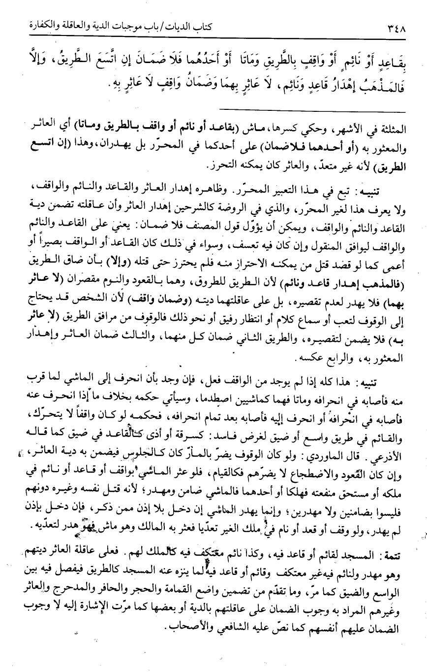 تَتِمَّةٌ: الْمَسْجِدُ لِقَائِمٍ أَوْ قَاعِدٍ فِيهِ، وَكَذَا نَائِمٌ مُعْتَكِفٌ فِيهِ كَالْمِلْكِ لَهُمْ. فَعَلَى عَاقِلَةِ الْعَاثِرِ دِيَتُهُمْ وَهُوَ مُهْدَرٌ وَلِنَائِمٍ فِيهِ غَيْرِ مُعْتَكِفٍ وَقَائِمٍ أَوْ قَاعِدٍ فِيهِ لِمَا يُنَزَّهُ عَنْهُ الْمَسْجِدُ كَالطَّرِيقِ فَيُفْصَلُ فِيهِ بَيْنَ الْوَاسِعِ وَالضَّيِّقِ كَمَا مَرَّ، وَمَا تَقَدَّمَ مِنْ تَضْمِينِ وَاضِعِ الْقُمَامَةِ وَالْحَجَرِ وَالْحَافِرِ وَالْمُدَحْرِجِ وَالْعَاثِرِ وَغَيْرِهِمْ الْمُرَادُ بِهِ وُجُوبُ الضَّمَانِ عَلَى عَاقِلَتِهِمْ بِالدِّيَةِ أَوْ بَعْضِهَا كَمَا مَرَّتْ الْإِشَارَةُ إلَيْهِ لَا وُجُوبُ الضَّمَانِ عَلَيْهِمْ أَنْفُسِهِمْ كَمَا نَصَّ عَلَيْهِ الشَّافِعِيُّ وَالْأَصْحَابُ.