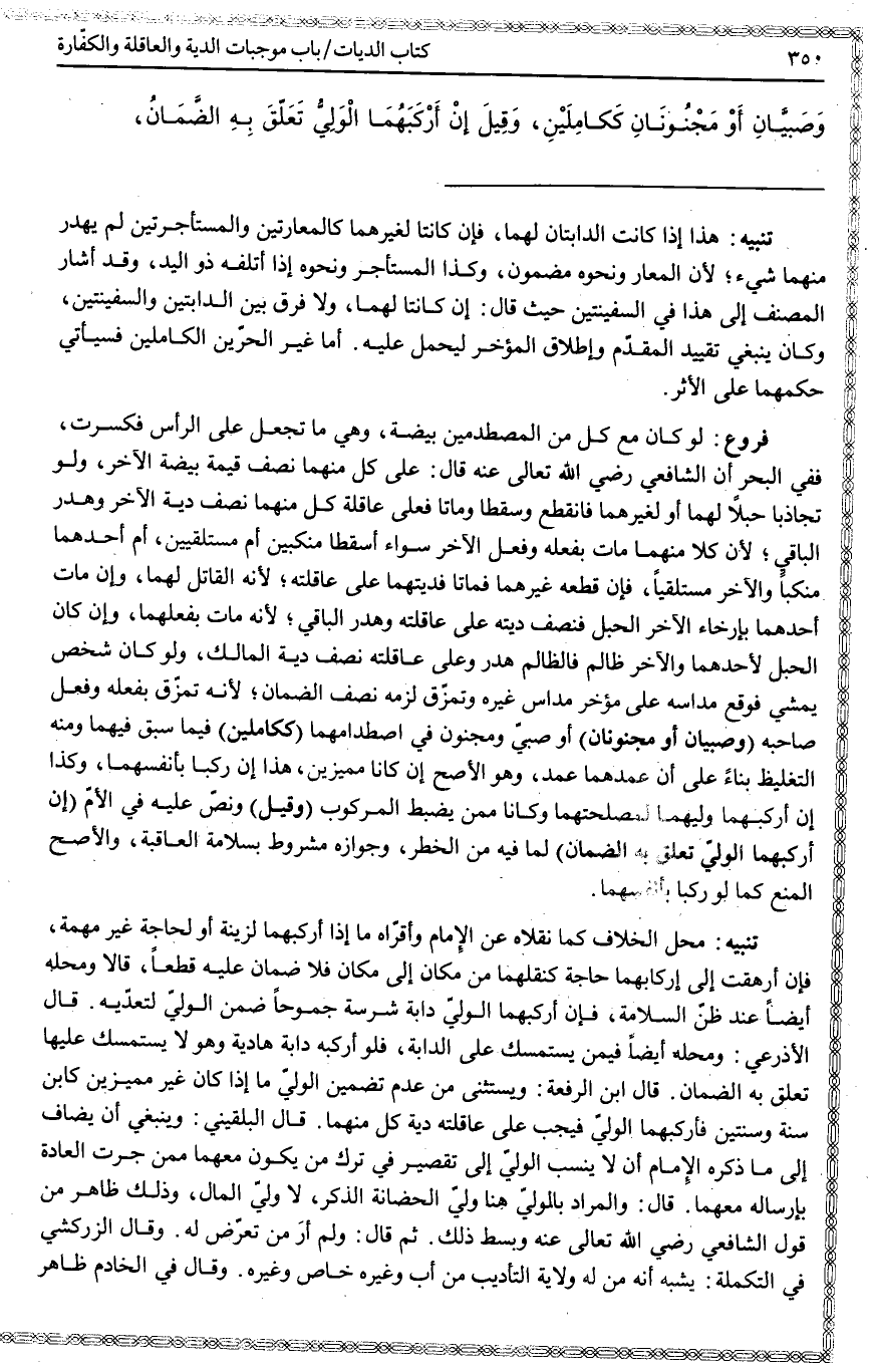 وَصَبِيَّانِ أَوْ مَجْنُونَانِ كَكَامِلَيْنِ، وَقِيلَ إنْ أَرْكَبَهُمَا الْوَلِيُّ تَعَلَّقَ بِهِ الضَّمَانُ،