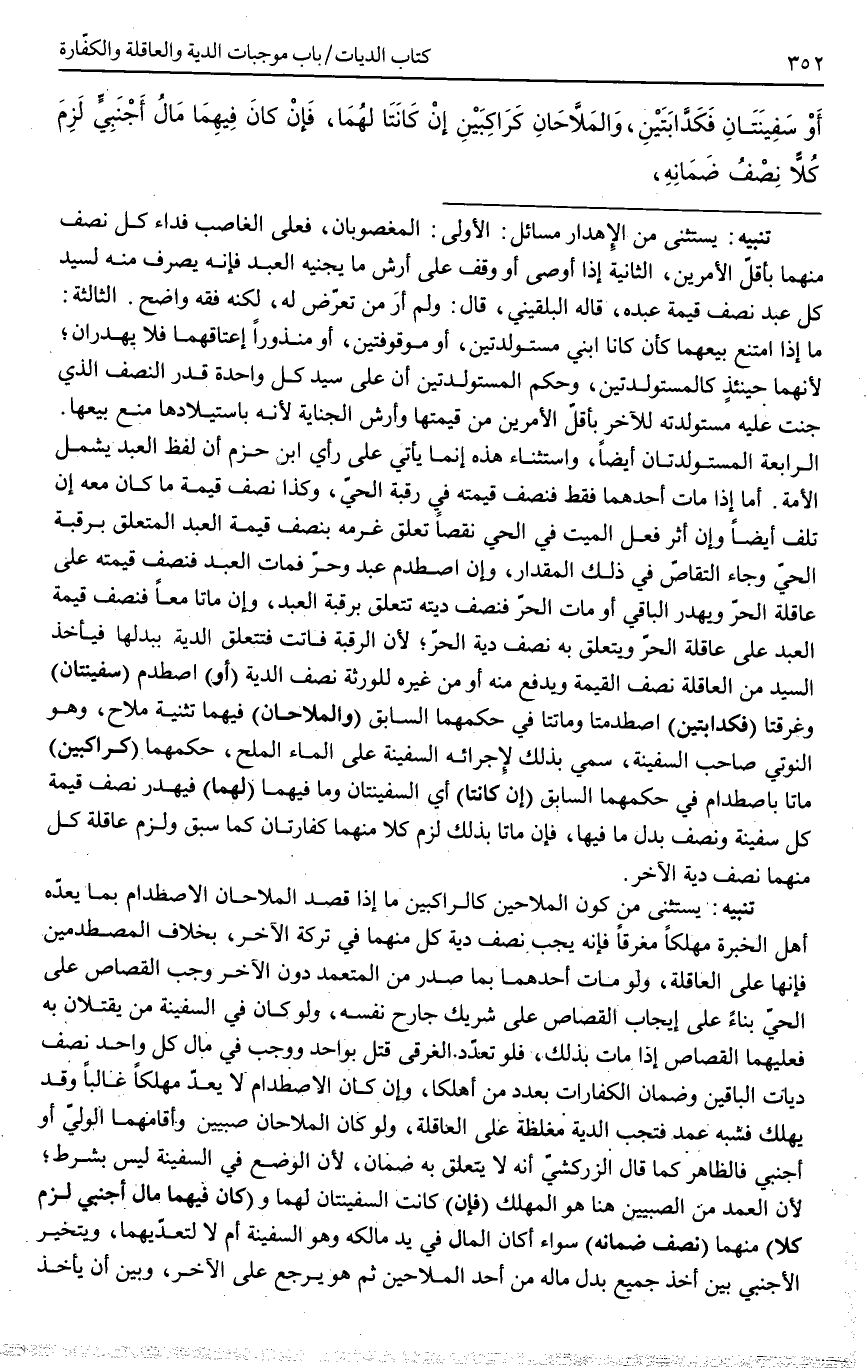 (أَوْ) اصْطَدَمَ (سَفِينَتَانِ) وَغَرِقَتَا (فَكَدَابَّتَيْنِ) اصْطَدَمَتَا وَمَاتَتَا فِي حُكْمِهِمَا السَّابِقِ (وَالْمَلَّاحَانِ) فِيهِمَا تَثْنِيَةُ مَلَّاحٍ، وَهُوَ النُّوتِيُّ صَاحِبُ السَّفِينَةِ، سُمِّيَ بِذَلِكَ لِإِجْرَائِهِ السَّفِينَةَ عَلَى الْمَاءِ الْمِلْحِ، حُكْمُهُمَا (كَرَاكِبَيْنِ) مَاتَا بِاصْطِدَامٍ فِي حُكْمِهِمَا السَّابِقِ (إنْ كَانَتَا) أَيْ السَّفِينَتَانِ وَمَا فِيهِمَا (لَهُمَا) فَيُهْدَرُ نِصْفُ قِيمَةِ كُلِّ سَفِينَةٍ وَنِصْفُ بَدَلِ مَا فِيهَا، فَإِنْ مَاتَا بِذَلِكَ لَزِمَ كُلًّا مِنْهُمَا كَفَّارَتَانِ كَمَا سَبَقَ وَلَزِمَ عَاقِلَةَ كُلٍّ مِنْهُمَا نِصْفُ دِيَةِ الْآخَرِ.