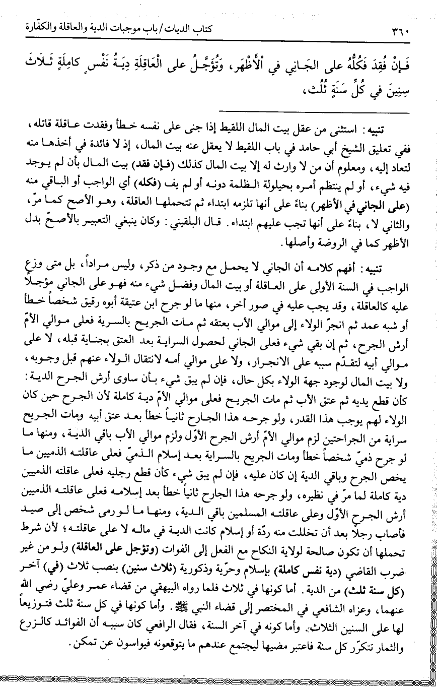 (وَتُؤَجَّلُ عَلَى الْعَاقِلَةِ) وَلَوْ مِنْ غَيْرِ ضَرْبِ الْقَاضِي (دِيَةُ نَفْسٍ كَامِلَةٍ) بِإِسْلَامٍ وَحُرِّيَّةٍ وَذُكُورِيَّةٍ (ثَلَاثَ سِنِينَ) بِنَصْبِ ثَلَاثٍ (فِي) آخِرِ (كُلِّ سَنَةٍ ثُلُثٌ) مِنْ الدِّيَةِ. أَمَّا كَوْنُهَا فِي ثَلَاثٍ فَلِمَا رَوَاهُ الْبَيْهَقِيُّ مِنْ قَضَاءِ عُمَرَ وَعَلِيٍّ - رَضِيَ اللَّهُ عَنْهُمَا -، وَعَزَاهُ الشَّافِعِيُّ فِي الْمُخْتَصَرِ إلَى قَضَاءِ النَّبِيِّ - صَلَّى اللَّهُ عَلَيْهِ وَسَلَّمَ -. وَأَمَّا كَوْنُهَا فِي كُلِّ سَنَةٍ ثُلُثًا فَتَوْزِيعًا لَهَا عَلَى السِّنِينَ الثَّلَاثِ. وَأَمَّا كَوْنُهُ فِي آخِرِ السَّنَةِ، فَقَالَ الرَّافِعِيُّ كَانَ سَبَبُهُ أَنَّ الْفَوَائِدَ كَالزَّرْعِ وَالثِّمَارِ تَتَكَرَّرُ كُلَّ سَنَةٍ فَاعْتُبِرَ مُضِيُّهَا لِيَجْتَمِعَ عِنْدَهُمْ مَا يَتَوَقَّعُونَهُ فَيُوَاسُونَ عَنْ تَمَكُّنٍ.