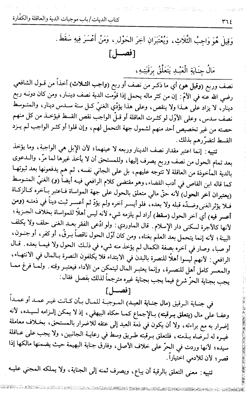 وَلَمَّا فَرَغَ مِمَّا يَجِبُ بِجِنَايَةِ الْحُرِّ شَرَعَ فِيمَا يَجِبُ بِجِنَايَةِ غَيْرِهِ مُتَرْجِمًا لِذَلِكَ بِفَصْلٍ فَقَالَ: [فَصْلٌ] فِي جِنَايَةِ الرَّقِيقِ (مَالُ جِنَايَةِ الْعَبْدِ) الْمُوجِبَةِ لِلْمَالِ بِأَنْ كَانَتْ غَيْرَ عَمْدٍ أَوْ عَمْدًا وَعَفَا عَلَى مَالٍ (يَتَعَلَّقُ بِرَقَبَتِهِ) بِالْإِجْمَاعِ كَمَا حَكَاهُ الْبَيْهَقِيُّ، إذْ لَا يُمْكِنُ إلْزَامُهُ لِسَيِّدِهِ، لِأَنَّهُ إضْرَارٌ بِهِ مَعَ بَرَاءَتِهِ، وَلَا أَنْ يَكُونَ فِي ذِمَّةِ الْعَبْدِ إلَى عِتْقِهِ لِلْأَضْرَارِ بِالْمُسْتَحِقِّ، بِخِلَافِ مُعَامَلَةِ غَيْرِهِ لَهُ لِرِضَاهُ بِذِمَّتِهِ، فَلْتُعَلَّقْ بِرَقَبَتِهِ طَرِيقٌ وَسَطٌ فِي رِعَايَةِ الْجَانِبَيْنِ، وَلَا يَجِبُ عَلَى عَاقِلَةِ سَيِّدِهِ؛ لِأَنَّهَا وَرَدَتْ فِي الْحُرِّ عَلَى خِلَافِ الْأَصْلِ، وَفَارَقَ جِنَايَةَ الْبَهِيمَةِ حَيْثُ يَضْمَنُهَا مَالِكُهَا إذَا قَصَّرَ؛ لِأَنَّ لِلْآدَمِيِّ اخْتِيَارًا.