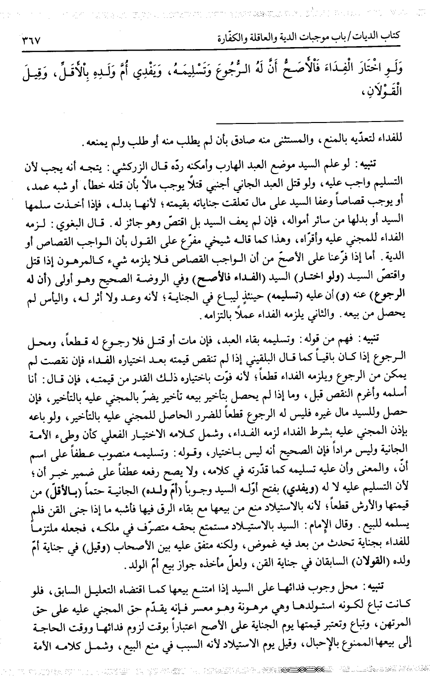 تَنْبِيهٌ: فُهِمَ مِنْ قَوْلِهِ: وَتَسْلِيمَهُ بَقَاءُ الْعَبْدِ، فَإِنْ مَاتَ أَوْ قُتِلَ فَلَا رُجُوعَ لَهُ قَطْعًا، وَمَحَلُّ الرُّجُوعِ إذَا كَانَ بَاقِيًا كَمَا قَالَ الْبُلْقِينِيُّ إذَا لَمْ تَنْقُصْ قِيمَتُهُ بَعْدَ اخْتِيَارِهِ الْفِدَاءَ فَإِنْ نَقَصَتْ لَمْ يُمَكَّنْ مِنْ الرُّجُوعِ وَيَلْزَمُهُ الْفِدَاءُ قَطْعًا؛ لِأَنَّهُ فَوَّتَ بِاخْتِيَارِهِ ذَلِكَ الْقَدْرَ مِنْ قِيمَتِهِ، فَإِنْ قَالَ: أَنَا أُسَلِّمُهُ وَأَغْرَمُ النَّقْصَ قُبِلَ، وَمَا إذَا لَمْ يَحْصُلْ بِتَأْخِيرِ بَيْعِهِ تَأْخِيرٌ يَضُرُّ بِالْمَجْنِيِّ عَلَيْهِ بِالتَّأْخِيرِ، فَإِنْ حَصَلَ وَلِلسَّيِّدِ مَالٌ غَيْرُهُ فَلَيْسَ لَهُ الرُّجُوعُ قَطْعًا لِلضَّرَرِ الْحَاصِلِ لِلْمَجْنِيِّ عَلَيْهِ بِالتَّأْخِيرِ، وَلَوْ بَاعَهُ بِإِذْنِ الْمَجْنِيِّ عَلَيْهِ بِشَرْطِ الْفِدَاءِ لَزِمَهُ الْفِدَاءُ، وَشَمَلَ كَلَامُهُ الِاخْتِيَارَ الْفِعْلِيَّ كَأَنْ وَطِئَ الْأَمَةَ الْجَانِيَةَ وَلَيْسَ مُرَادًا فَإِنَّ الصَّحِيحَ أَنَّهُ لَيْسَ بِاخْتِيَارٍ، وَقَوْلُهُ: وَتَسْلِيمَهُ مَنْصُوبٌ عَطْفًا عَلَى اسْمِ أَنَّ، وَالْمَعْنَى وَأَنَّ عَلَيْهِ تَسْلِيمَهُ كَمَا قَدَّرْتُهُ فِي كَلَامِهِ، وَلَا يَصِحُّ رَفْعُهُ عَطْفًا عَلَى ضَمِيرِ خَبَرِ أَنَّ؛ لِأَنَّ التَّسْلِيمَ عَلَيْهِ لَا لَهُ.