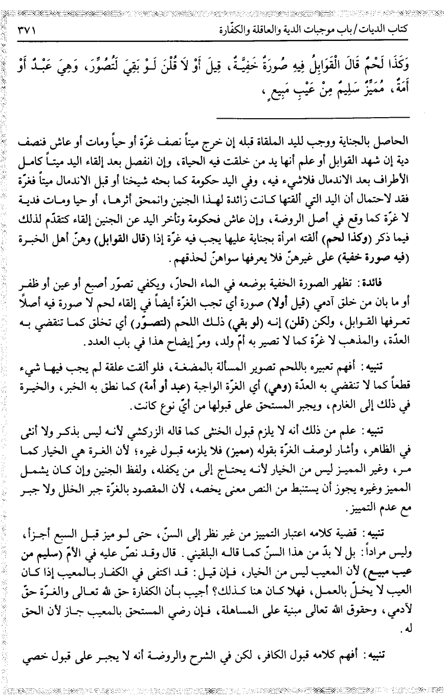 (وَكَذَا لَحْمٌ) أَلْقَتْهُ امْرَأَةٌ بِجِنَايَةٍ عَلَيْهَا يَجِبُ فِيهِ غُرَّةٌ إذَا (قَالَ الْقَوَابِلُ) وَهُنَّ أَهْلُ الْخِبْرَةِ (فِيهِ صُورَةٌ خَفِيَّةٌ) عَلَى غَيْرِهِنَّ فَلَا يَعْرِفُهَا سِوَاهُنَّ لِحَذْقِهِنَّ. فَائِدَةٌ: تَظْهَرُ الصُّورَةُ الْخَفِيَّةُ بِوَضْعِهِ فِي الْمَاءِ الْحَارِّ، وَيَكْفِي تَصَوُّرُ أُصْبُعٍ أَوْ عَيْنٍ أَوْ ظُفْرٍ أَوْ مَا بَانَ مِنْ خَلْقِ آدَمِيٍّ (قِيلَ أَوْ لَا) صُورَةَ أَيْ تَجِبُ الْغُرَّةُ أَيْضًا فِي إلْقَاءِ لَحْمٍ لَا صُورَةَ فِيهِ أَصْلًا تَعْرِفُهَا الْقَوَابِلُ، وَلَكِنْ (قُلْنَ) إنَّهُ (لَوْ بَقِيَ) ذَلِكَ اللَّحْمُ (لَتَصَوَّرَ) أَيْ تَخَلَّقَ كَمَا تَنْقَضِي بِهِ الْعِدَّةُ، وَالْمَذْهَبُ لَا غُرَّةَ كَمَا لَا تَصِيرُ بِهِ أُمَّ وَلَدٍ، وَمَرَّ إيضَاحُ هَذَا فِي بَابِ الْعَدَدِ تَنْبِيهٌ: أَفْهَمَ تَعْبِيرُهُ بِاللَّحْمِ تَصْوِيرَ الْمَسْأَلَةِ بِالْمُضْغَةِ، فَلَوْ أَلْقَتْ عَلَقَةً لَمْ يَجِبْ فِيهَا شَيْءٌ قَطْعًا كَمَا لَا تَنْقَضِي بِهِ الْعِدَّةُ.