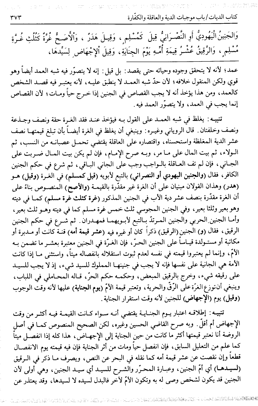 ثُمَّ شَرَعَ فِي حُكْمِ الْجَنِينِ الرَّقِيقِ، فَقَالَ (وَ) الْجَنِينُ (الرَّقِيقُ) ذَكَرًا كَانَ أَوْ غَيْرَهُ فِيهِ (عُشْرُ قِيمَةِ أُمِّهِ) قِنَّةً كَانَتْ أَوْ مُدَبَّرَةً أَوْ مُكَاتَبَةً أَوْ مُسْتَوْلَدَةً قِيَاسًا عَلَى الْجَنِينِ الْحُرِّ، فَإِنَّ الْغُرَّةَ فِي الْجَنِينِ مُعْتَبَرَةٌ بِعُشْرِ مَا تَضْمَنُ بِهِ الْأُمُّ، وَإِنَّمَا لَمْ يَعْتَبِرُوا قِيمَتَهُ فِي نَفْسِهِ لِعَدَمِ ثُبُوتِ اسْتِقْلَالِهِ بِانْفِصَالِهِ مَيِّتًا، وَاسْتُثْنِيَ مَا إذَا كَانَتْ الْأَمَةُ هِيَ الْجَانِيَةَ عَلَى نَفْسِهَا فَإِنَّهُ لَا يَجِبُ فِي جَنِينِهَا الْمَمْلُوكِ لِلسَّيِّدِ شَيْءٌ، إذْ لَا يَجِبُ لِلسَّيِّدِ عَلَى رَقِيقِهِ شَيْءٌ، وَخَرَجَ بِالرَّقِيقِ الْمُبَعَّضُ، وَحُكْمُهُ حُكْمُ الْحُرِّ، قَالَهُ الْمَحَامِلِيُّ فِي اللُّبَابِ، وَيَنْبَغِي أَنْ تُوَزَّعَ الْغُرَّةُ عَلَى الرِّقِّ وَالْحُرِّيَّةِ، وَتُعْتَبَرُ قِيمَةُ الْأُمِّ (يَوْمَ الْجِنَايَةِ) عَلَيْهَا لِأَنَّهُ وَقْتُ الْوُجُوبِ (وَقِيلَ) يَوْمَ (الْإِجْهَاضِ) لِلْجَنِينِ لِأَنَّهُ وَقْتُ اسْتِقْرَارِ الْجِنَايَةِ.