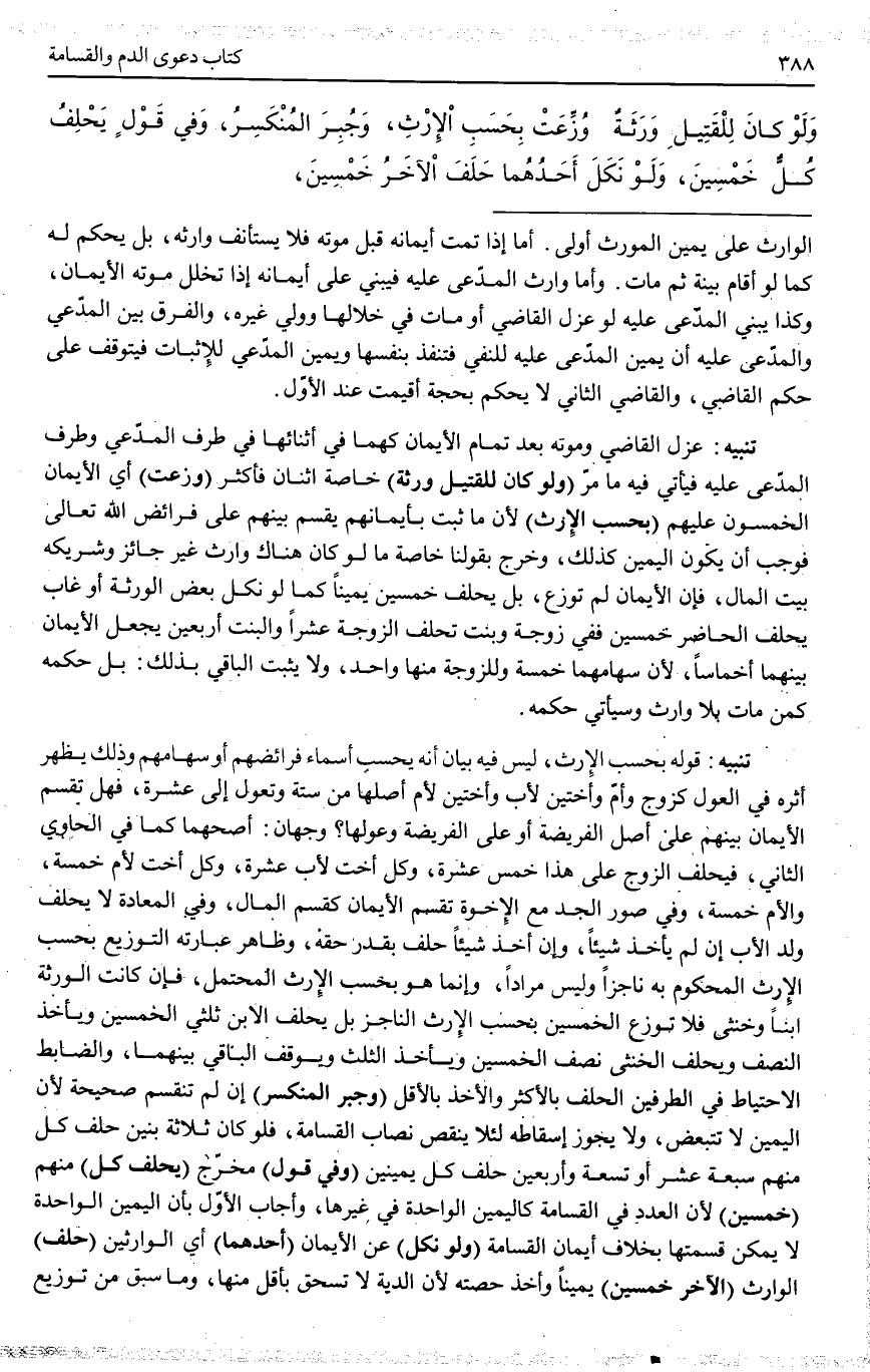 تَنْبِيهٌ: قَوْلُهُ بِحَسَبِ الْإِرْثِ، لَيْسَ فِيهِ بَيَانُ أَنَّهُ يُحْسَبُ أَسْمَاءُ فَرَائِضِهِمْ أَوْ سِهَامِهِمْ وَذَلِكَ يَظْهَرُ أَثَرُهُ فِي الْعَوْلِ كَزَوْجٍ وَأُمٍّ وَأُخْتَيْنِ لِأَبٍ وَأُخْتَيْنِ لِأُمٍّ أَصْلُهَا مِنْ سِتَّةٍ وَتَعُولُ إلَى عَشَرَةٍ، فَهَلْ تُقَسَّمُ الْأَيْمَانُ بَيْنَهُمْ عَلَى أَصْلِ الْفَرِيضَةِ أَوْ عَلَى الْفَرِيضَةِ وَعَوْلِهَا؟ وَجْهَانِ: أَصَحُّهُمَا كَمَا فِي الْحَاوِي الثَّانِي، فَيَحْلِفُ الزَّوْجُ عَلَى هَذَا خَمْسَ عَشْرَةَ، وَكُلُّ أُخْتٍ لِأَبٍ عَشَرَةً، وَكُلُّ أُخْتٍ لِأُمٍّ خَمْسَةً، وَالْأُمُّ خَمْسَةً، وَفِي صُوَرِ الْجَدِّ مَعَ الْإِخْوَةِ تُقَسَّمُ الْأَيْمَانُ كَقَسْمِ الْمَالِ، وَفِي الْمُعَادَةِ لَا يَحْلِفُ وَلَدُ الْأَبِ إنْ لَمْ يَأْخُذْ شَيْئًا، وَإِنْ أَخَذَ شَيْئًا حَلَفَ بِقَدْرِ حَقِّهِ، وَظَاهِرُ عِبَارَتِهِ التَّوْزِيعُ بِحَسَبِ الْإِرْثِ الْمَحْكُومِ بِهِ نَاجِزًا وَلَيْسَ مُرَادًا، وَإِنَّمَا هُوَ بِحَسَبِ الْإِرْثِ الْمُحْتَمَلِ، فَإِنْ كَانَتْ الْوَرَثَةُ ابْنًا وَخُنْثَى فَلَا تُوَزَّعُ الْخَمْسُونَ بِحَسَبِ الْإِرْثِ النَّاجِزِ بَلْ يَحْلِفُ الِابْنُ ثُلُثَيْ الْخَمْسِينَ وَيَأْخُذُ النِّصْفَ وَيَحْلِفُ الْخُنْثَى نِصْفَ الْخَمْسِينَ وَيَأْخُذُ الثُّلُثَ وَيُوقَفُ الْبَاقِي بَيْنَهُمَا، وَالضَّابِطُ الِاحْتِيَاطُ فِي الطَّرَفَيْنِ الْحَلِفُ بِالْأَكْثَرِ وَالْأَخْذُ بِالْأَقَلِّ (وَجُبِرَ الْمُنْكَسِرُ) إنْ لَمْ تَنْقَسِمْ صَحِيحَةً لِأَنَّ الْيَمِينَ لَا تَتَبَعَّضُ، وَلَا يَجُوزُ إسْقَاطُهُ لِئَلَّا يَنْقُصَ نِصَابُ الْقَسَامَةِ، فَلَوْ كَانَ ثَلَاثَةُ بَنِينَ حَلَفَ كُلٌّ مِنْهُمْ سَبْعَةَ عَشَرَ أَوْ تِسْعَةً وَأَرْبَعِينَ حَلَفَ كُلٌّ يَمِينَيْنِ (وَفِي قَوْلٍ) مُخَرَّجٍ (يَحْلِفُ كُلٌّ) مِنْهُمْ (خَمْسِينَ) لِأَنَّ الْعَدَدَ فِي الْقَسَامَةِ كَالْيَمِينِ الْوَاحِدَةِ فِي غَيْرِهَا.