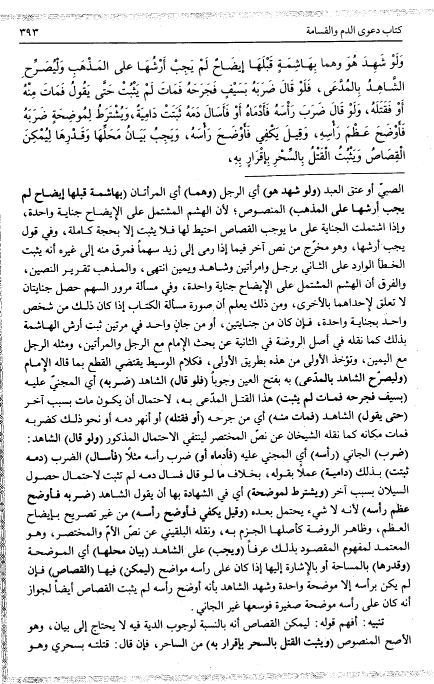 وَلَوْ شَهِدَ هُوَ وَهُمَا بِهَاشِمَةٍ قَبْلَهَا إيضَاحٌ لَمْ يَجِبْ أَرْشُهَا عَلَى الْمَذْهَبِ وَلْيُصَرِّحْ الشَّاهِدُ بِالْمُدَّعَى، فَلَوْ قَالَ ضَرَبَهُ بِسَيْفٍ فَجَرَحَهُ فَمَاتَ لَمْ يَثْبُتْ حَتَّى يَقُولَ فَمَاتَ مِنْهُ أَوْ فَقَتَلَهُ، وَلَوْ قَالَ ضَرَبَ رَأْسَهُ فَأَدْمَاهُ أَوْ فَأَسَالَ دَمَهُ ثَبَتَتْ دَامِيَةٌ، وَيُشْتَرَطُ لِمُوضِحَةٍ ضَرَبَهُ فَأَوْضَحَ عَظْمَ رَأْسِهِ، وَقِيلَ يَكْفِي فَأَوْضَحَ رَأْسَهُ، وَيَجِبُ بَيَانُ مَحَلِّهَا وَقَدْرِهَا لِيُمْكِنَ الْقِصَاصُ