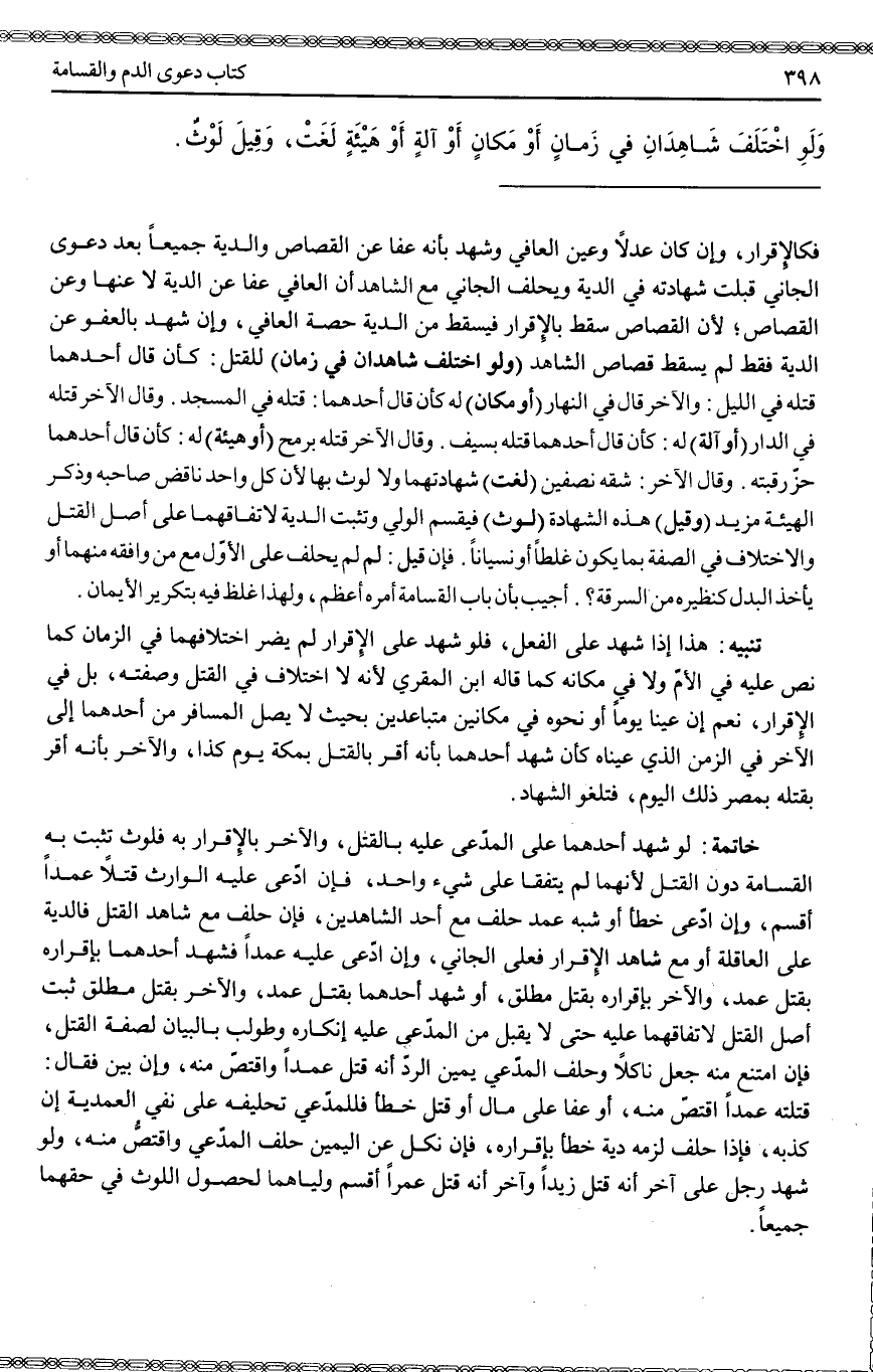 خَاتِمَةٌ: لَوْ شَهِدَ أَحَدُهُمَا عَلَى الْمُدَّعَى عَلَيْهِ بِالْقَتْلِ، وَالْآخَرُ بِالْإِقْرَارِ بِهِ فَلَوْثٌ تَثْبُتُ بِهِ الْقَسَامَةُ دُونَ الْقَتْلِ لِأَنَّهُمَا لَمْ يَتَّفِقَا عَلَى شَيْءٍ وَاحِدٍ، فَإِنْ ادَّعَى عَلَيْهِ الْوَارِثُ قَتْلًا عَمْدًا أَقْسَمَ، وَإِنْ ادَّعَى خَطَأً أَوْ شِبْهَ عَمْدٍ حَلَفَ مَعَ أَحَدِ الشَّاهِدَيْنِ، فَإِنْ حَلَفَ مَعَ شَاهِدِ الْقَتْلِ فَالدِّيَةُ عَلَى الْعَاقِلَةِ أَوْ مَعَ شَاهِدِ الْإِقْرَارِ فَعَلَى الْجَانِي، وَإِنْ ادَّعَى عَلَيْهِ عَمْدًا فَشَهِدَ أَحَدُهُمَا بِإِقْرَارِهِ بِقَتْلٍ عَمْدٍ، وَالْآخَرُ بِإِقْرَارِهِ بِقَتْلٍ مُطْلَقٍ، أَوْ شَهِدَ أَحَدُهُمَا بِقَتْلٍ عَمْدٍ، وَالْآخَرُ بِقَتْلٍ مُطْلَقٍ ثَبَتَ أَصْلُ الْقَتْلِ لِاتِّفَاقِهِمَا عَلَيْهِ حَتَّى لَا يُقْبَلَ مِنْ الْمُدَّعَى عَلَيْهِ إنْكَارُهُ وَطُولِبَ بِالْبَيَانِ لِصِفَةِ الْقَتْلِ، فَإِنْ امْتَنَعَ مِنْهُ جُعِلَ نَاكِلًا وَحَلَفَ الْمُدَّعِي يَمِينَ الرَّدِّ أَنَّهُ قَتَلَ عَمْدًا وَاقْتَصَّ مِنْهُ، وَإِنْ بَيَّنَ فَقَالَ: قَتَلْتُهُ عَمْدًا اقْتَصَّ مِنْهُ، أَوْ عَفَا عَلَى مَالٍ أَوْ قَتْلَ خَطَإٍ فَلِلْمُدَّعِي تَحْلِيفُهُ عَلَى نَفْيِ الْعَمْدِيَّةِ إنْ كَذَّبَهُ، فَإِذَا حَلَفَ لَزِمَهُ دِيَةُ خَطَإٍ بِإِقْرَارِهِ، فَإِنْ نَكَلَ عَنْ الْيَمِينِ حَلَفَ الْمُدَّعِي وَاقْتَصَّ مِنْهُ، وَلَوْ شَهِدَ رَجُلٌ عَلَى آخَرَ أَنَّهُ قَتَلَ زَيْدًا وَآخَرُ أَنَّهُ قَتَلَ عَمْرًا أَقْسَمَ وَلِيَّاهُمَا لِحُصُولِ اللَّوْثِ فِي حَقِّهِمَا جَمِيعًا.