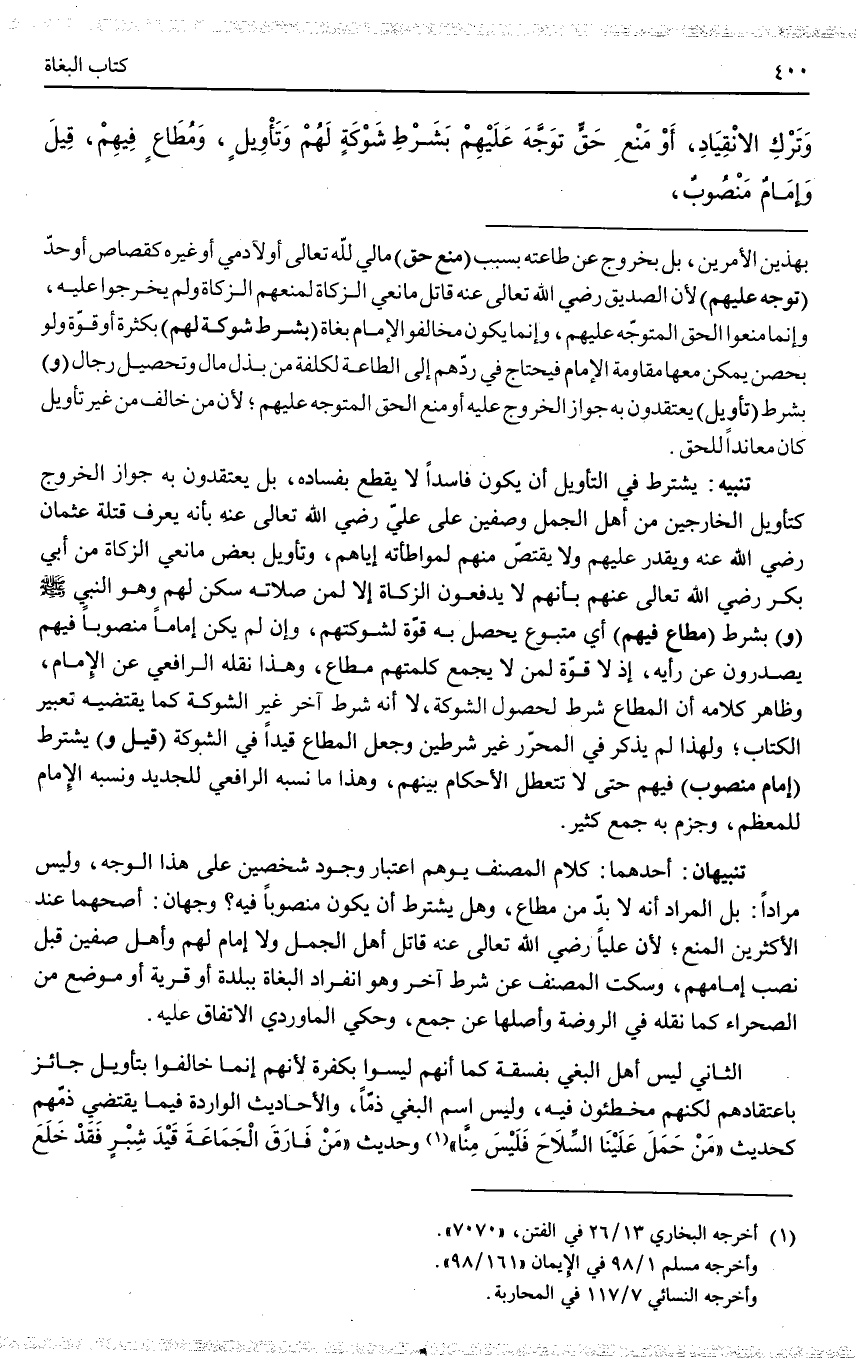 تَنْبِيهٌ: يُشْتَرَطُ فِي التَّأْوِيلِ أَنْ يَكُونَ فَاسِدًا لَا يُقْطَعُ بِفَسَادِهِ، بَلْ يَعْتَقِدُونَ بِهِ جَوَازَ الْخُرُوجِ كَتَأْوِيلِ الْخَارِجِينَ مِنْ أَهْلِ الْجَمَلِ وَصِفِّينَ عَلَى عَلِيٍّ - رَضِيَ اللَّهُ تَعَالَى عَنْهُ - بِأَنَّهُ يَعْرِفُ قَتَلَةَ عُثْمَانَ - رَضِيَ اللَّهُ عَنْهُ - وَيَقْدِرُ عَلَيْهِمْ وَلَا يَقْتَصُّ مِنْهُمْ لِمُوَاطَأَتِهِ إيَّاهُمْ، وَتَأْوِيلِ بَعْضِ مَانِعِي الزَّكَاةِ مِنْ أَبِي بَكْرٍ - رَضِيَ اللَّهُ تَعَالَى عَنْهُمْ - بِأَنَّهُمْ لَا يَدْفَعُونَ الزَّكَاةَ إلَّا لِمَنْ صَلَاتُهُ سَكَنٌ لَهُمْ وَهُوَ النَّبِيُّ - صَلَّى اللَّهُ عَلَيْهِ وَسَلَّمَ - (وَ) بِشَرْطٍ (مُطَاعٍ فِيهِمْ) أَيْ مَتْبُوعٍ يَحْصُلُ بِهِ قُوَّةٌ لِشَوْكَتِهِمْ، وَإِنْ لَمْ يَكُنْ إمَامًا مَنْصُوبًا فِيهِمْ يَصْدُرُونَ عَنْ رَأْيِهِ، إذْ لَا قُوَّةَ لِمَنْ لَا يَجْمَعُ كَلِمَتَهُمْ مُطَاعٌ، وَهَذَا نَقَلَهُ الرَّافِعِيُّ عَنْ الْإِمَامِ، وَظَاهِرُ كَلَامِهِ أَنَّ الْمُطَاعَ شَرْطٌ لِحُصُولِ الشَّوْكَةِ، لَا أَنَّهُ شَرْطٌ آخَرُ غَيْرُ الشَّوْكَةِ كَمَا يَقْتَضِيهِ تَعْبِيرُ الْكِتَابِ؛ وَلِهَذَا لَمْ يَذْكُرْ فِي الْمُحَرَّرِ غَيْرَ شَرْطَيْنِ وَجَعَلَ الْمُطَاعَ قَيْدًا فِي الشَّوْكَةِ (قِيلَ وَ) يُشْتَرَطُ (إمَامٌ مَنْصُوبٌ) فِيهِمْ حَتَّى لَا تَتَعَطَّلَ الْأَحْكَامُ بَيْنَهُمْ، وَهَذَا مَا نَسَبَهُ الرَّافِعِيُّ لِلْجَدِيدِ وَنَسَبَهُ الْإِمَامُ لِلْمُعْظَمِ، وَجَزَمَ بِهِ جَمْعٌ كَثِيرٌ.