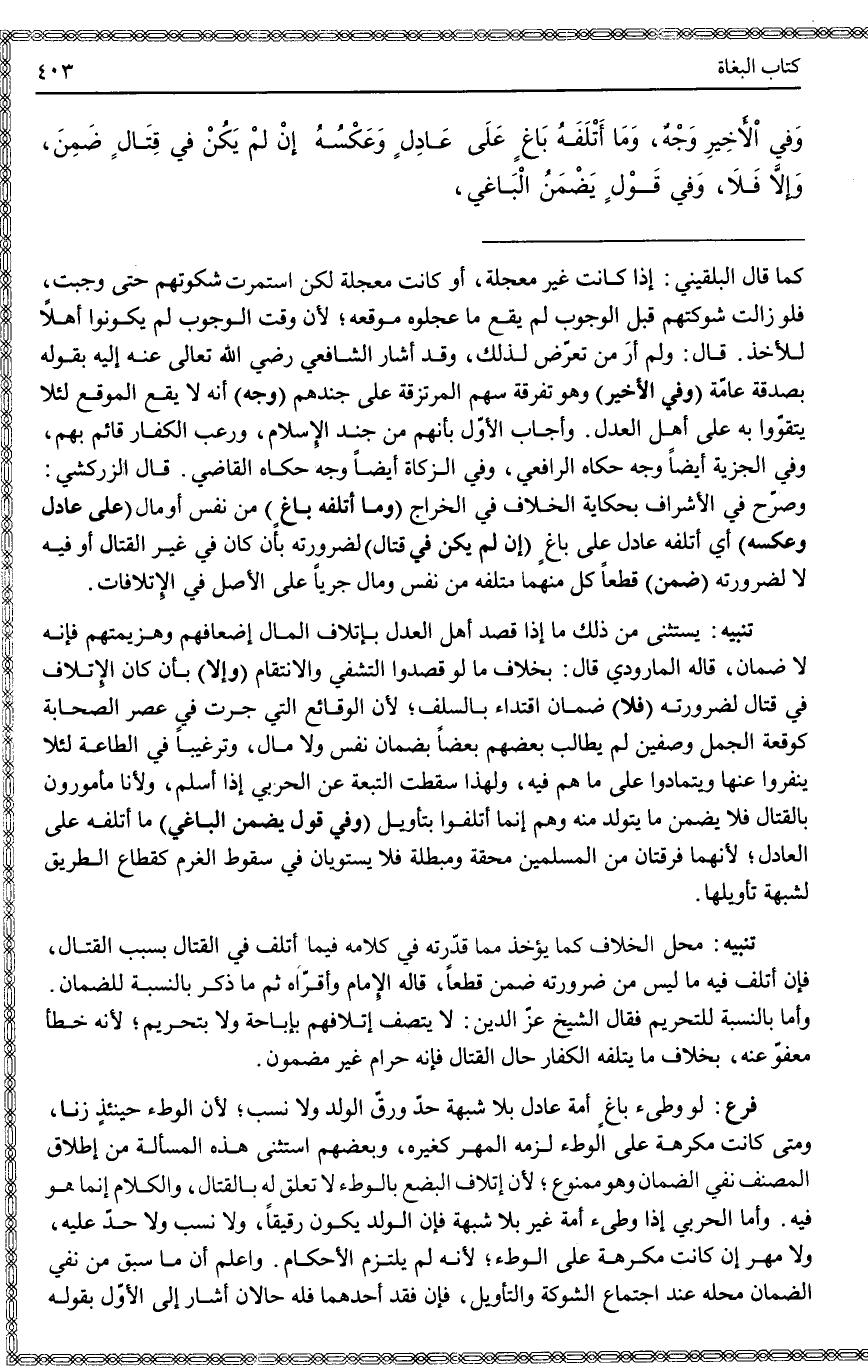 (وَمَا أَتْلَفَهُ بَاغٍ) مِنْ نَفْسٍ أَوْ مَالٍ (عَلَى عَادِلٍ وَعَكْسُهُ) أَيْ أَتْلَفَهُ عَادِلٌ عَلَى بَاغٍ (إنْ لَمْ يَكُنْ فِي قِتَالٍ) لِضَرُورَتِهِ بِأَنْ كَانَ فِي غَيْرِ الْقِتَالِ أَوْ فِيهِ لَا لِضَرُورَتِهِ (ضَمِنَ) قَطْعًا كُلٌّ مِنْهُمَا مُتْلَفَهُ مِنْ نَفْسٍ وَمَالٍ جَرْيًا عَلَى الْأَصْلِ فِي الْإِتْلَافَاتِ.