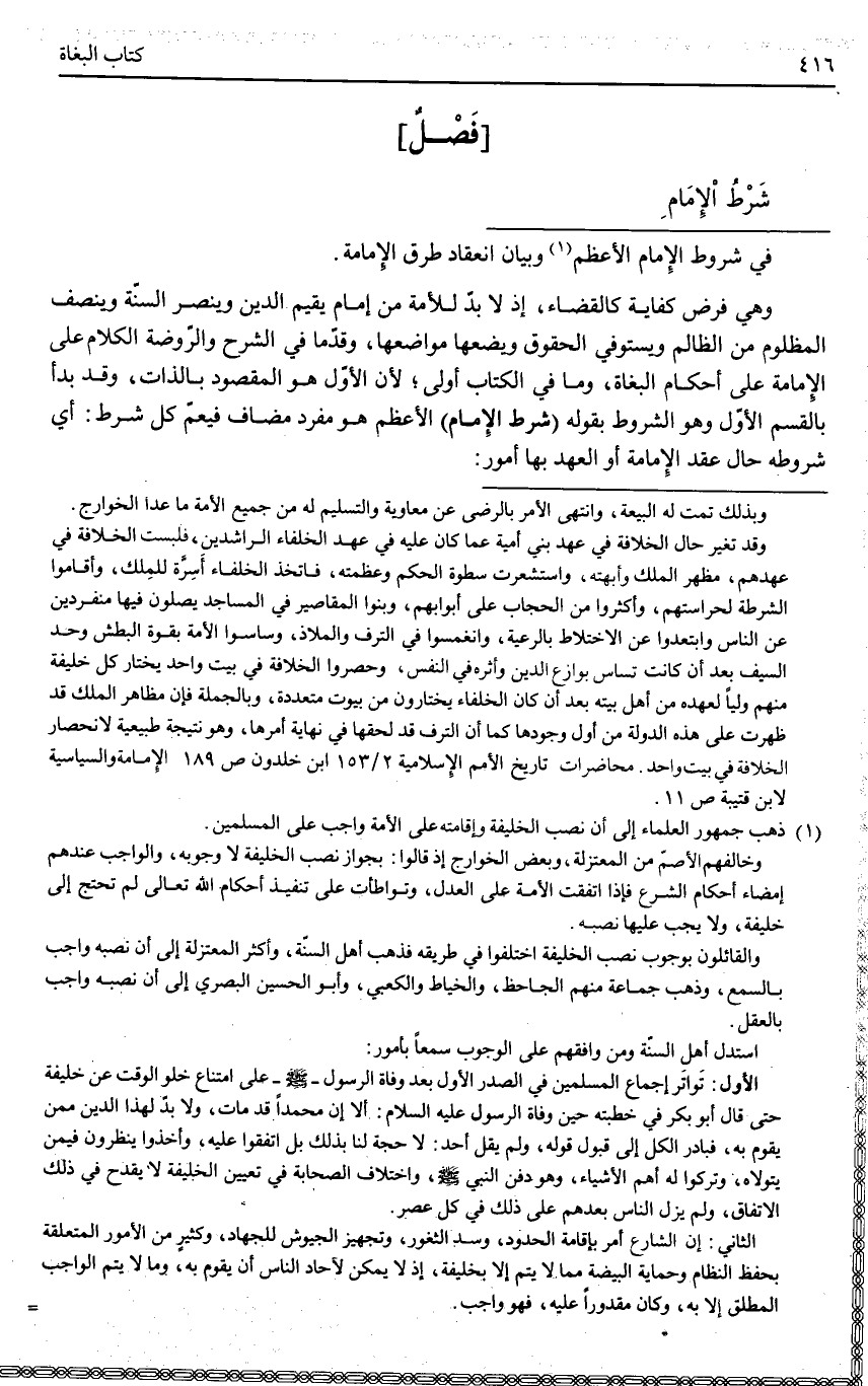 ـــــــــــــــــــــــــــــQفِي شُرُوطِ الْإِمَامِ الْأَعْظَمِ وَبَيَانِ انْعِقَادِ طُرُقِ الْإِمَامَةِ. وَهِيَ فَرْضُ كِفَايَةٍ كَالْقَضَاءِ، إذْ لَا بُدَّ لِلْأُمَّةِ مِنْ إمَامٍ يُقِيمُ الدِّينَ وَيَنْصُرُ السُّنَّةَ وَيُنْصِفُ الْمَظْلُومَ مِنْ الظَّالِمِ وَيَسْتَوْفِي الْحُقُوقَ وَيَضَعُهَا مَوَاضِعَهَا، وَقَدَّمَا فِي الشَّرْحِ وَالرَّوْضَةِ الْكَلَامَ عَلَى الْإِمَامَةِ عَلَى أَحْكَامِ الْبُغَاةِ، وَمَا فِي الْكِتَابِ أَوْلَى؛ لِأَنَّ الْأَوَّلَ هُوَ الْمَقْصُودُ بِالذَّاتِ، وَقَدْ بَدَأَ بِالْقِسْمِ الْأَوَّلِ وَهُوَ: الشُّرُوطُ بِقَوْلِهِ (شَرْطُ الْإِمَامِ) الْأَعْظَمِ هُوَ مُفْرَدٌ مُضَافٌ فَيَعُمُّ كُلَّ شَرْطٍ: أَيْ شُرُوطِهِ حَالَ عَقْدِ الْإِمَامَةِ أَوْ الْعَهْدِ بِهَا، أُمُورٌ: