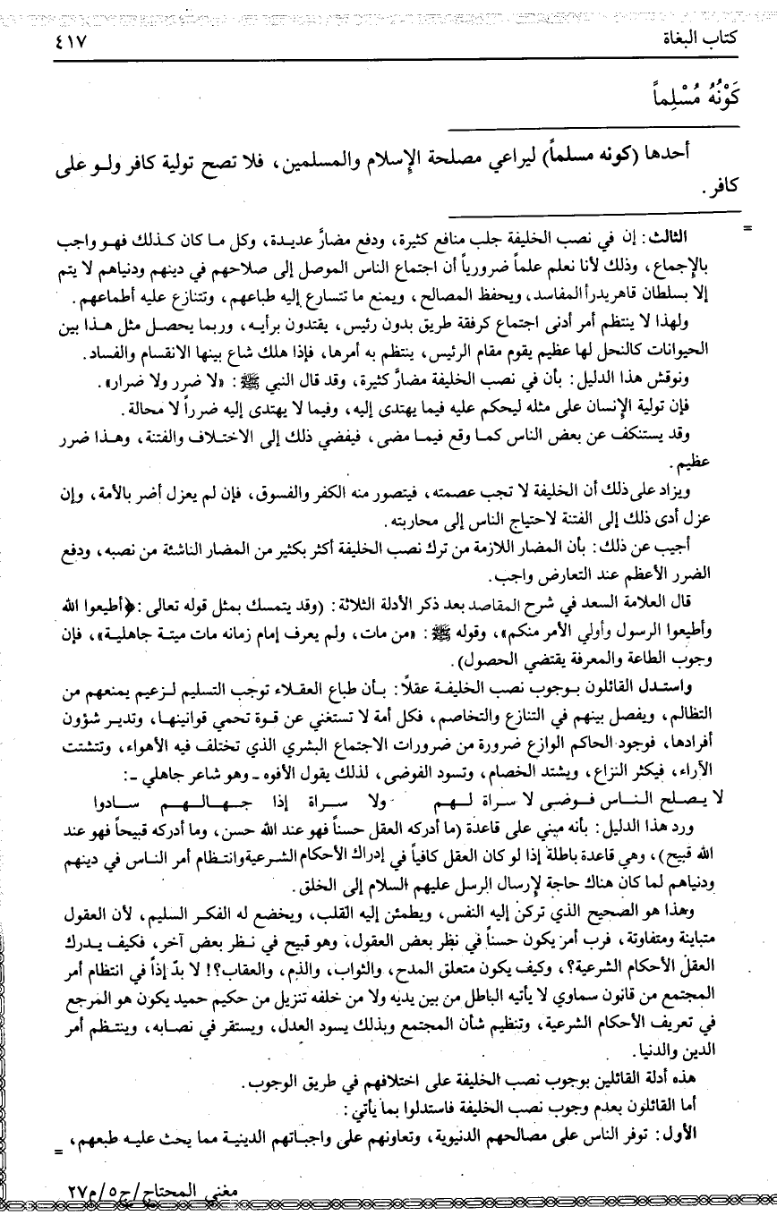 ـــــــــــــــــــــــــــــQأَحَدُهَا (كَوْنُهُ مُسْلِمًا) لِيُرَاعِيَ مَصْلَحَةَ الْإِسْلَامِ وَالْمُسْلِمِينَ، فَلَا تَصِحُّ تَوْلِيَةُ كَافِرٍ وَلَوْ عَلَى كَافِرٍ