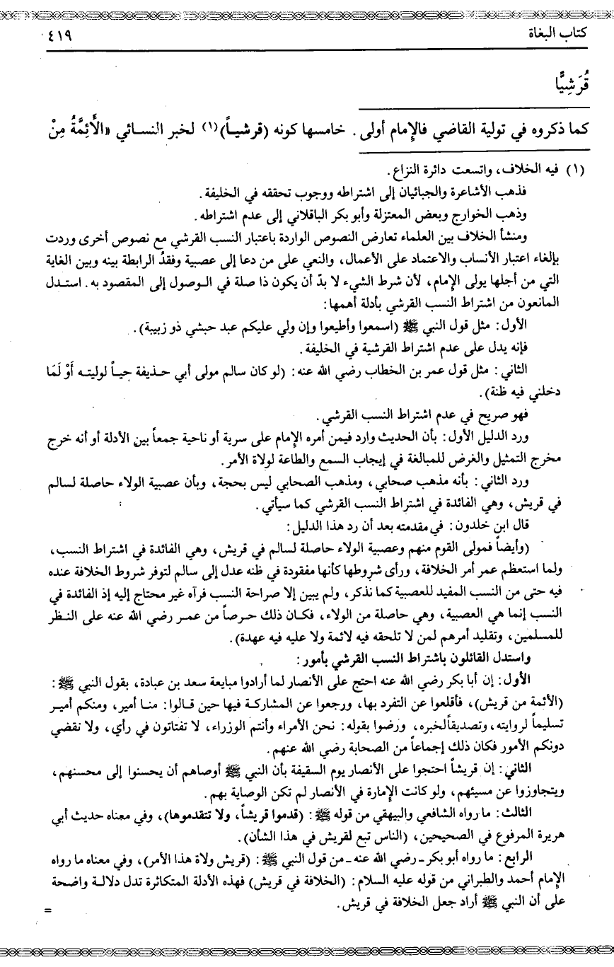 خَامِسُهَا كَوْنُهُ (قُرَشِيًّا) لِخَبَرِ النَّسَائِيّ «الْأَئِمَّةُ مِنْ قُرَيْشٍ»