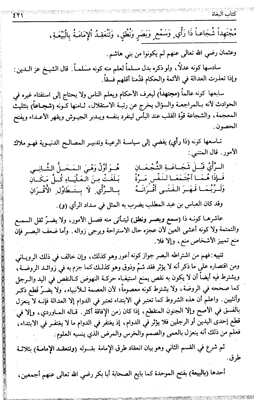 ـــــــــــــــــــــــــــــQوَعُثْمَانَ - رَضِيَ اللَّهُ تَعَالَى عَنْهُمْ - لَمْ يَكُونُوا مِنْ بَنِي هَاشِمٍ. سَادِسُهَا: كَوْنُهُ عَدْلًا، وَلَوْ ذَكَرَهُ بَدَلَ مُسْلِمًا لَعُلِمَ مِنْهُ كَوْنُهُ مُسْلِمًا. قَالَ الشَّيْخُ عِزُّ الدِّينِ: وَإِذَا تَعَذَّرَتْ الْعَدَالَةُ فِي الْأَئِمَّةِ وَالْحُكَّامِ قَدَّمْنَا أَقَلَّهُمْ فِسْقًا. سَابِعُهَا: كَوْنُهُ عَالِمًا (مُجْتَهِدًا) لِيَعْرِفَ الْأَحْكَامَ وَيُعَلِّمَ النَّاسَ وَلَا يَحْتَاجَ إلَى اسْتِفْتَاءِ غَيْرِهِ فِي الْحَوَادِثِ لِأَنَّهُ بِالْمُرَاجَعَةِ وَالسُّؤَالِ يَخْرُجُ عَنْ رُتْبَةِ الِاسْتِقْلَالِ، ثَامِنُهَا: كَوْنُهُ (شُجَاعًا) بِتَثْلِيثِ الْمُعْجَمَةِ، وَالشَّجَاعَةُ قُوَّةُ الْقَلْبِ عِنْدَ الْبَأْسِ لِيَنْفَرِدَ بِنَفْسِهِ وَيُدَبِّرَ الْجُيُوشَ وَيَقْهَرَ الْأَعْدَاءَ وَيَفْتَحَ الْحُصُونَ. تَاسِعُهَا: كَوْنُهُ (ذَا رَأْيٍ) يُفْضِي إلَى سِيَاسَةِ الرَّعِيَّةِ وَتَدْبِيرِ الْمَصَالِحِ الدُّنْيَوِيَّةِ فَهُوَ مِلَاكُ الْأُمُورِ. قَالَ الْمُتَنَبِّي: