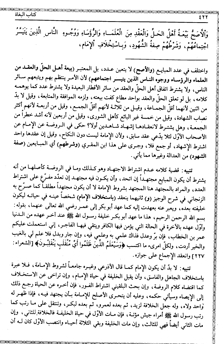 ـــــــــــــــــــــــــــــQوَاخْتُلِفَ فِي عَدَدِ الْمُبَايِعِ (وَالْأَصَحُّ) لَا يَتَعَيَّنُ عَدَدٌ، بَلْ الْمُعْتَبَرُ (بَيْعَةُ أَهْلِ الْحَلِّ وَالْعَقْدِ مِنْ الْعُلَمَاءِ وَالرُّؤَسَاءِ وَوُجُوهِ النَّاسِ الَّذِينَ يَتَيَسَّرُ اجْتِمَاعُهُمْ) لِأَنَّ الْأَمْرَ يَنْتَظِمُ بِهِمْ وَيَتْبَعُهُمْ سَائِرُ النَّاسِ، وَلَا يُشْتَرَطُ اتِّفَاقُ أَهْلِ الْحَلِّ وَالْعَقْدِ مِنْ سَائِرِ الْأَقْطَارِ الْبَعِيدَةِ وَلَا يُشْتَرَطُ عَدَدٌ كَمَا يُوهِمُهُ كَلَامُهُ، بَلْ لَوْ تَعَلَّقَ الْحَلُّ وَالْعَقْدُ بِوَاحِدٍ مُطَاعٍ كَفَتْ بَيْعَتُهُ، وَلَزِمَهُ الْمُوَافَقَةُ وَالْمُتَابَعَةُ، وَقِيلَ لَا بُدَّ مِنْ اثْنَيْنِ لِأَنَّهُمَا أَقَلُّ الْجَمَاعَةِ، وَقِيلَ مِنْ ثَلَاثَةٍ لِأَنَّهُمْ أَقَلُّ الْجَمْعِ، وَقِيلَ مِنْ أَرْبَعَةٍ لِأَنَّهُمْ أَكْثَرُ نِصَابِ الشَّهَادَةِ، وَقِيلَ مِنْ خَمْسَةٍ غَيْرِ الْبَائِعِ كَأَهْلِ الشُّورَى، وَقِيلَ مِنْ أَرْبَعِينَ لِأَنَّهُ أَشَدُّ خَطَرًا مِنْ الْجُمُعَةِ، وَهَلْ يُشْتَرَطُ لِانْعِقَادِهَا إشْهَادُ شَاهِدَيْنِ أَوْ لَا؟ حَكَى فِي الرَّوْضَةِ عَنْ الْإِمَامِ عَنْ الْأَصْحَابِ الْأَوَّلَ لِئَلَّا يُدْعَى عَقْدٌ سَابِقٌ، وَلِأَنَّ الْإِمَامَةَ لَيْسَتْ دُونَ النِّكَاحِ، وَقِيلَ إنْ عَقَدَهَا وَاحِدٌ اُشْتُرِطَ الْإِشْهَادُ، أَوْ جَمْعٌ فَلَا، وَجَرَى عَلَى هَذَا ابْنُ الْمُقْرِي (وَشَرْطُهُمْ) أَيْ الْمُبَايِعِينَ (صِفَةُ الشُّهُودِ) مِنْ الْعَدَالَةِ وَغَيْرِهَا مِمَّا يَأْتِي.