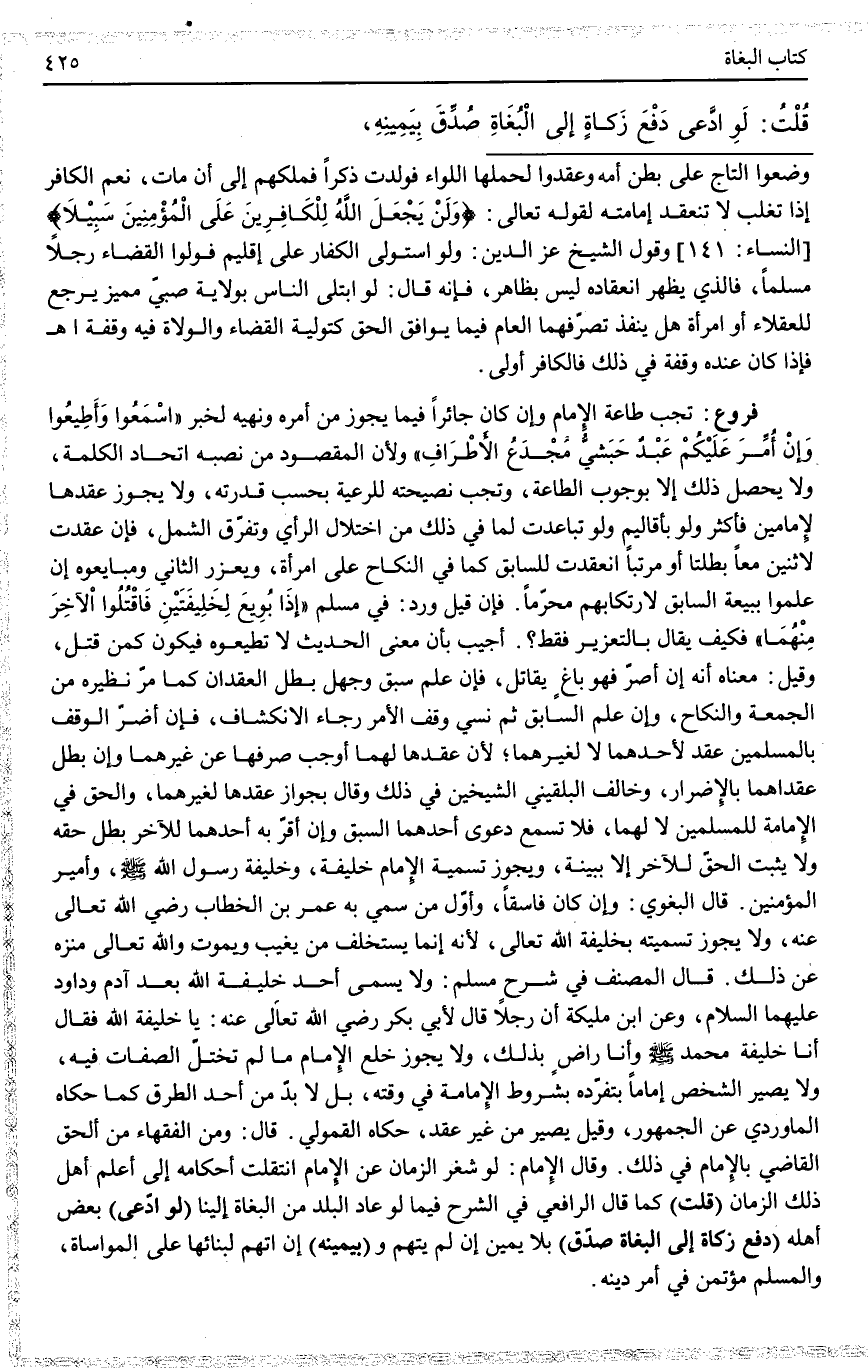 قَالَ: وَمِنْ الْفُقَهَاءِ مَنْ أَلْحَقَ الْقَاضِيَ بِالْإِمَامِ فِي ذَلِكَ. وَقَالَ الْإِمَامُ: لَوْ شَغَرَ الزَّمَانُ عَنْ الْإِمَامِ انْتَقَلَتْ أَحْكَامُهُ إلَى أَعْلَمِ أَهْلِ ذَلِكَ الزَّمَانِ (قُلْتُ) كَمَا قَالَ الرَّافِعِيُّ فِي الشَّرْحِ فِيمَا لَوْ عَادَ الْبَلَدُ مِنْ الْبُغَاةِ إلَيْنَا (لَوْ ادَّعَى) بَعْضُ أَهْلِهِ (دَفْعَ زَكَاةٍ إلَى الْبُغَاةِ صُدِّقَ) بِلَا يَمِينٍ إنْ لَمْ يُتَّهَمْ وَ (بِيَمِينِهِ) إنْ اُتُّهِمَ لِبِنَائِهَا عَلَى الْمُوَاسَاةِ، وَالْمُسْلِمُ مُؤْتَمَنٌ فِي أَمْرِ دِينِهِ.
