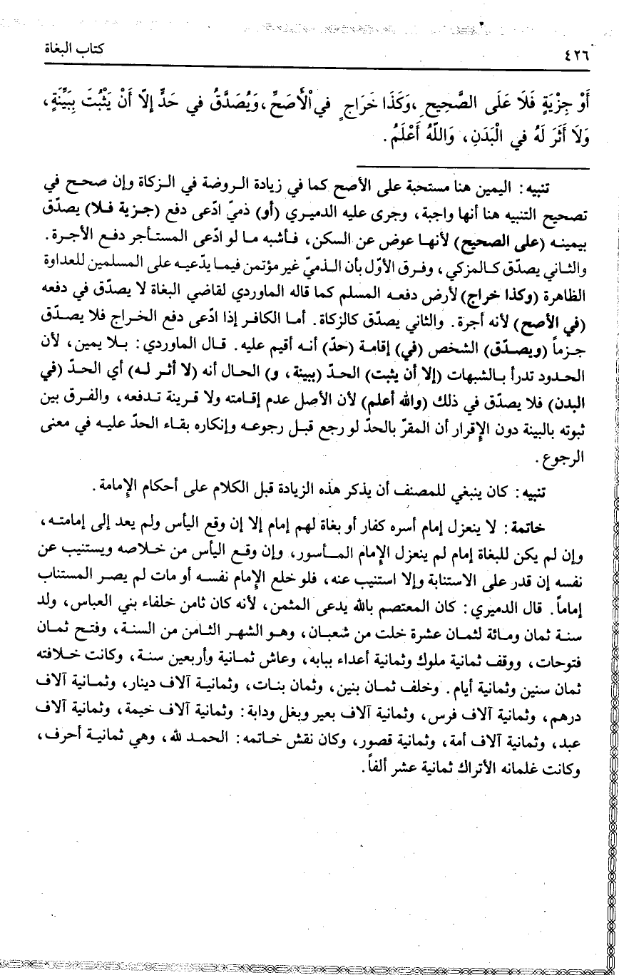 ـــــــــــــــــــــــــــــQتَنْبِيهٌ: الْيَمِينُ هُنَا مُسْتَحَبَّةٌ عَلَى الْأَصَحِّ كَمَا فِي زِيَادَةِ الرَّوْضَةِ فِي الزَّكَاةِ وَإِنْ صَحَّحَ فِي تَصْحِيحِ التَّنْبِيهِ هُنَا أَنَّهَا وَاجِبَةٌ، وَجَرَى عَلَيْهِ الدَّمِيرِيُّ (أَوْ) ذِمِّيٌّ ادَّعَى دَفْعَ (جِزْيَةٍ فَلَا) يُصَدَّقُ بِيَمِينِهِ (عَلَى الصَّحِيحِ) لِأَنَّهَا عِوَضٌ عَنْ السَّكَنِ، فَأَشْبَهَ مَا لَوْ ادَّعَى الْمُسْتَأْجِرُ دَفْعَ الْأُجْرَةِ. وَالثَّانِي يُصَدَّقُ كَالْمُزَكِّي، وَفَرَّقَ الْأَوَّلُ بِأَنَّ الذِّمِّيَّ غَيْرُ مُؤْتَمَنٍ فِيمَا يَدَّعِيهِ عَلَى الْمُسْلِمِينَ لِلْعَدَاوَةِ الظَّاهِرَةِ (وَكَذَا خَرَاجٌ) لِأَرْضٍ دَفَعَهُ الْمُسْلِمُ كَمَا قَالَهُ الْمَاوَرْدِيُّ لِقَاضِي الْبُغَاةِ لَا يُصَدَّقُ فِي دَفْعِهِ (فِي الْأَصَحِّ) لِأَنَّهُ أُجْرَةٌ. وَالثَّانِي يُصَدَّقُ كَالزَّكَاةِ. أَمَّا الْكَافِرُ إذَا ادَّعَى دَفْعَ الْخَرَاجِ فَلَا يُصَدَّقُ جَزْمًا (وَيُصَدَّقُ) الشَّخْصُ (فِي) إقَامَةِ (حَدٍّ) أَنَّهُ أُقِيمَ عَلَيْهِ. قَالَ الْمَاوَرْدِيُّ: بِلَا يَمِينٍ، لِأَنَّ الْحُدُودَ تُدْرَأُ بِالشُّبُهَاتِ (إلَّا أَنْ يَثْبُتَ) الْحَدُّ (بِبَيِّنَةٍ، وَ) الْحَالُ أَنَّهُ (لَا أَثَرَ لَهُ) أَيْ الْحَدِّ (فِي الْبَدَنِ) فَلَا يُصَدَّقُ فِي ذَلِكَ (وَاَللَّهُ أَعْلَمُ) لِأَنَّ الْأَصْلَ عَدَمُ إقَامَتِهِ وَلَا قَرِينَةَ تَدْفَعُهُ، وَالْفَرْقُ بَيْنَ ثُبُوتِهِ بِالْبَيِّنَةِ دُونَ الْإِقْرَارِ أَنَّ الْمُقِرَّ بِالْحَدِّ لَوْ رَجَعَ قَبْلَ رُجُوعِهِ وَإِنْكَارِهِ بَقَاءَ الْحَدِّ عَلَيْهِ فِي مَعْنَى الرُّجُوعِ.