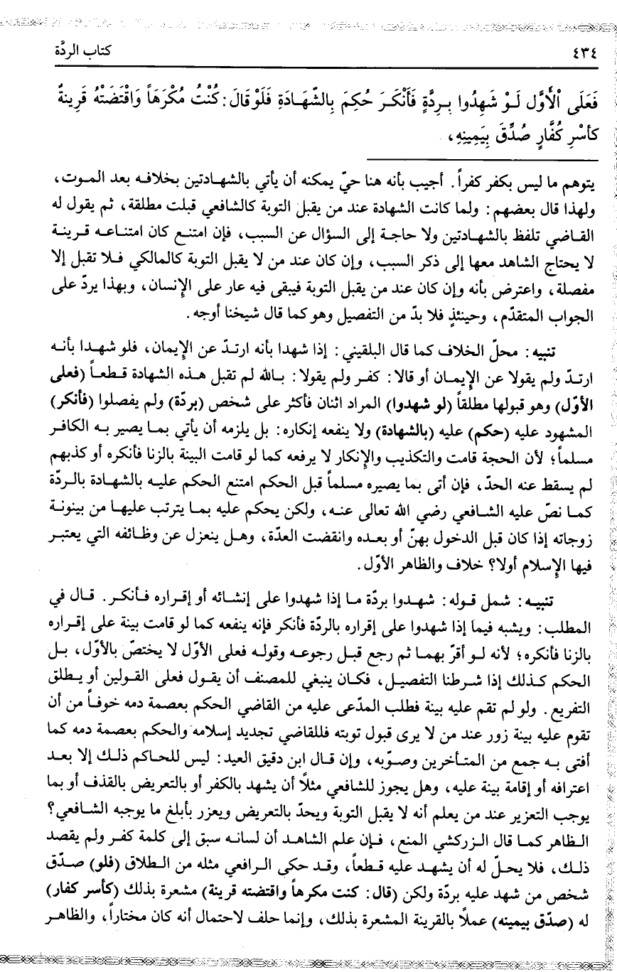 تَنْبِيهٌ: شَمِلَ قَوْلُهُ: شَهِدُوا بِرِدَّةٍ مَا إذَا شَهِدُوا عَلَى إنْشَائِهِ أَوْ إقْرَارِهِ فَأَنْكَرَ. قَالَ فِي الْمَطْلَبِ: وَيُشْبِهُ فِيمَا إذَا شَهِدُوا عَلَى إقْرَارِهِ بِالرِّدَّةِ فَأَنْكَرَ فَإِنَّهُ يَنْفَعُهُ كَمَا لَوْ قَامَتْ بَيِّنَةٌ عَلَى إقْرَارِهِ بِالزِّنَا فَأَنْكَرَهُ؛ لِأَنَّهُ لَوْ أَقَرَّ بِهِمَا ثُمَّ رَجَعَ قَبْلَ رُجُوعِهِ، وَقَوْلُهُ فَعَلَى الْأَوَّلِ لَا يَخْتَصُّ بِالْأَوَّلِ، بَلْ الْحُكْمُ كَذَلِكَ إذَا شَرَطْنَا التَّفْصِيلَ، فَكَانَ يَنْبَغِي لِلْمُصَنِّفِ أَنْ يَقُولَ فَعَلَى الْقَوْلَيْنِ أَوْ يُطْلِقَ التَّفْرِيعَ. وَلَوْ لَمْ تَقُمْ عَلَيْهِ بَيِّنَةٌ فَطَلَبَ الْمُدَّعَى عَلَيْهِ مِنْ الْقَاضِي الْحُكْمَ بِعِصْمَةِ دَمِهِ خَوْفًا مِنْ أَنْ تَقُومَ عَلَيْهِ بَيِّنَةُ زُورٍ عِنْدَ مَنْ لَا يَرَى قَبُولَ تَوْبَتِهِ فَلِلْقَاضِي تَجْدِيدُ إسْلَامِهِ، وَالْحُكْمُ بِعِصْمَةِ دَمِهِ كَمَا أَفْتَى بِهِ جَمْعٌ مِنْ الْمُتَأَخِّرِينَ وَصَوَّبَهُ. وَإِنْ قَالَ ابْنُ دَقِيقِ الْعِيدِ: لَيْسَ لِلْحَاكِمِ ذَلِكَ إلَّا بَعْدَ اعْتِرَافِهِ أَوْ إقَامَةِ بَيِّنَةٍ عَلَيْهِ، وَهَلْ يَجُوزُ لِلشَّافِعِيِّ مَثَلًا أَنْ يَشْهَدَ بِالْكُفْرِ أَوْ بِالتَّعْرِيضِ بِالْقَذْفِ أَوْ بِمَا يُوجِبُ التَّعْزِيرَ عِنْدَ مَنْ يَعْلَمُ أَنَّهُ لَا يَقْبَلُ التَّوْبَةَ وَيَحُدُّ بِالتَّعْرِيضِ وَيُعَزِّرُ بِأَبْلَغَ مَا يُوجِبُهُ الشَّافِعِيُّ، وَالظَّاهِرُ كَمَا قَالَ الزَّرْكَشِيُّ الْمَنْعُ، فَإِنْ عَلِمَ الشَّاهِدُ أَنَّ لِسَانَهُ سَبَقَ إلَى كَلِمَةِ كُفْرٍ وَلَمْ يَقْصِدْ ذَلِكَ، فَلَا يَحِلُّ لَهُ أَنْ يَشْهَدَ عَلَيْهِ قَطْعًا، وَقَدْ حَكَى الرَّافِعِيُّ مِثْلَهُ مِنْ الطَّلَاقِ (فَلَوْ) صَدَّقَ شَخْصٌ مَنْ شَهِدَ عَلَيْهِ بِرِدَّةٍ وَلَكِنْ.