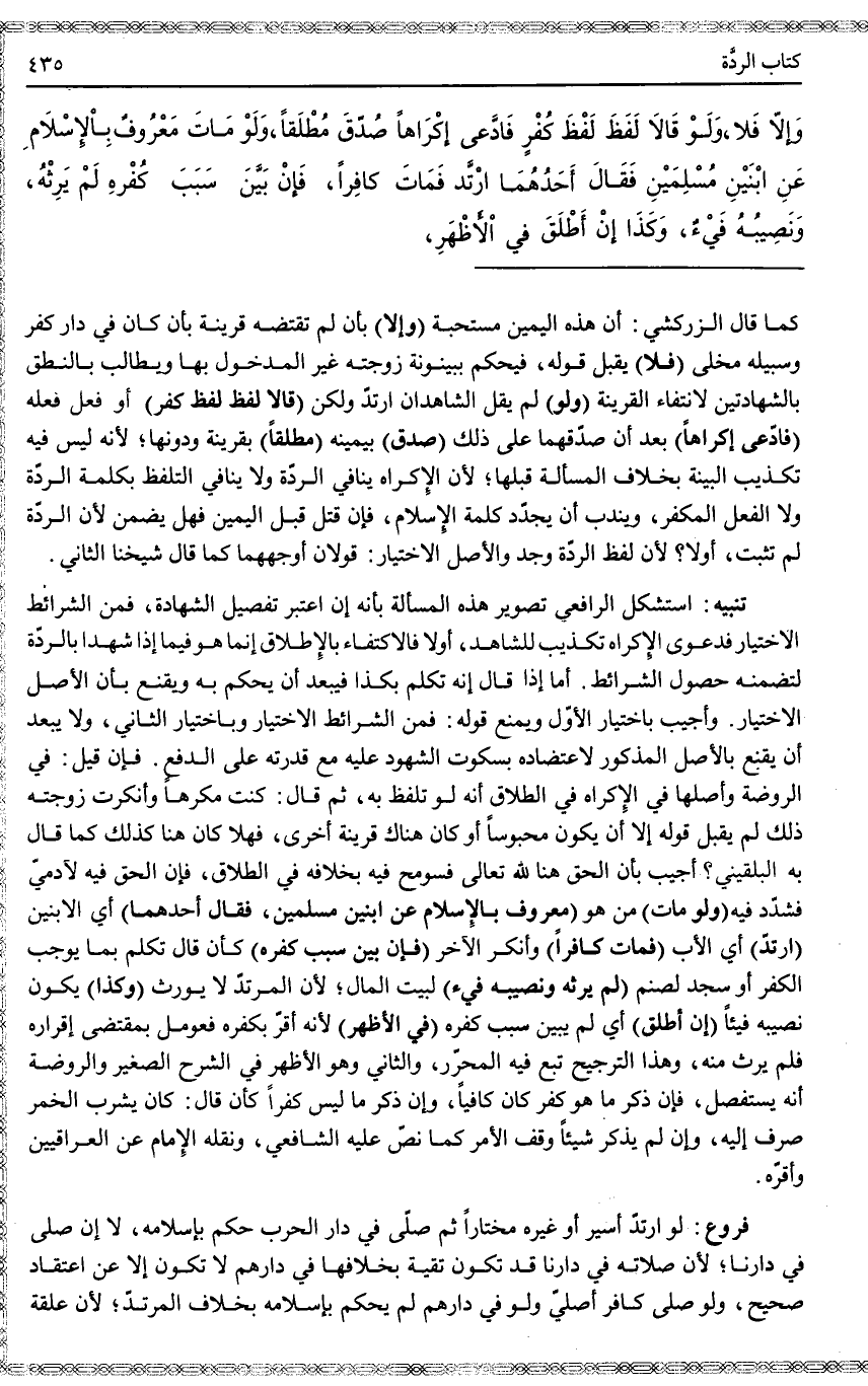 ـــــــــــــــــــــــــــــQكَمَا قَالَ الزَّرْكَشِيُّ: أَنَّ هَذِهِ الْيَمِينَ مُسْتَحَبَّةٌ (وَإِلَّا) بِأَنْ لَمْ تَقْتَضِهِ قَرِينَةٌ بِأَنْ كَانَ فِي دَارِ كُفْرٍ وَسَبِيلُهُ مُخَلًّى (فَلَا) يُقْبَلُ قَوْلُهُ، فَيُحْكَمُ بِبَيْنُونَةِ زَوْجِهِ غَيْرِ الْمَدْخُولِ بِهَا وَيُطَالَبُ بِالنُّطْقِ بِالشَّهَادَتَيْنِ لِانْتِفَاءِ الْقَرِينَةِ (وَلَوْ) لَمْ يَقُلْ الشَّاهِدَانِ ارْتَدَّ وَلَكِنْ (قَالَا لَفَظَ لَفْظَ كُفْرٍ) أَوْ فَعَلَ فِعْلَهُ (فَادَّعَى إكْرَاهًا) بَعْدَ أَنْ صَدَّقَهُمَا عَلَى ذَلِكَ (صُدِّقَ) بِيَمِينِهِ (مُطْلَقًا) بِقَرِينَةٍ وَدُونِهَا؛ لِأَنَّهُ لَيْسَ فِيهِ تَكْذِيبُ الْبَيِّنَةِ بِخِلَافِ الْمَسْأَلَةِ قَبْلَهَا؛ لِأَنَّ الْإِكْرَاهَ يُنَافِي الرِّدَّةَ وَلَا يُنَافِي التَّلَفُّظَ بِكَلِمَةِ الرِّدَّةِ وَلَا الْفِعْلَ الْمُكَفِّرَ، وَيُنْدَبُ أَنْ يُجَدِّدَ كَلِمَةَ الْإِسْلَامِ، فَإِنْ قُتِلَ قَبْلَ الْيَمِينِ فَهَلْ يَضْمَنُ لِأَنَّ الرِّدَّةَ لَمْ تَثْبُتْ، أَوْ لَا؟ لِأَنَّ لَفْظَ الرِّدَّةِ وُجِدَ وَالْأَصْلُ الِاخْتِيَارُ: قَوْلَانِ أَوْجَهُهُمَا كَمَا قَالَ شَيْخُنَا الثَّانِي.