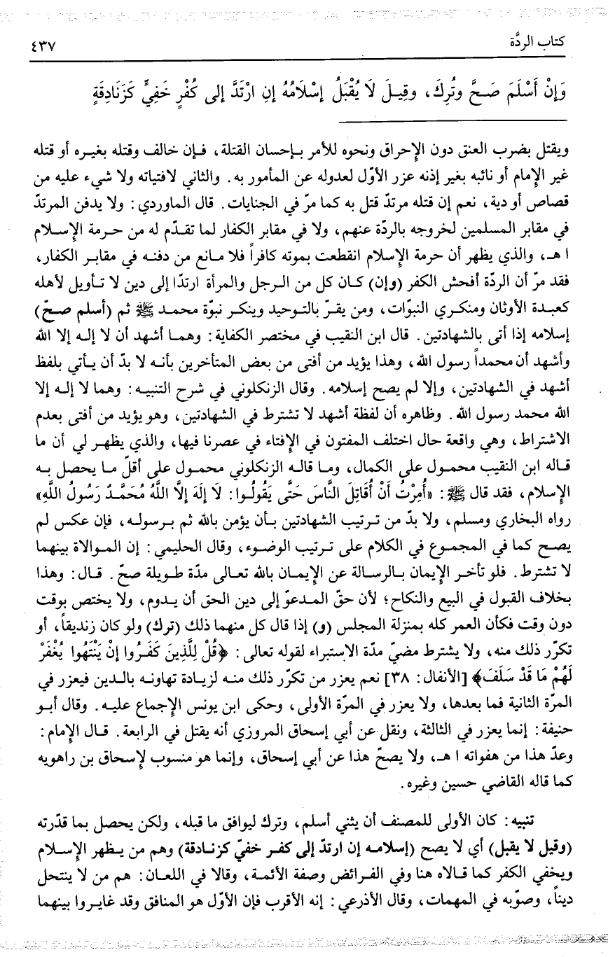 وَاَلَّذِي يَظْهَرُ أَنَّ حُرْمَةَ الْإِسْلَامِ انْقَطَعَتْ بِمَوْتِهِ كَافِرًا فَلَا مَانِعَ مِنْ دَفْنِهِ فِي مَقَابِرِ الْكُفَّارِ، فَقَدْ مَرَّ أَنَّ الرِّدَّةَ أَفْحَشُ الْكُفْرِ (وَإِنْ) كَانَ كُلٌّ مِنْ الرَّجُلِ وَالْمَرْأَةِ ارْتَدَّا إلَى دِينٍ لَا تَأْوِيلَ لِأَهْلِهِ كَعَبَدَةِ الْأَوْثَانِ وَمُنْكِرِي النُّبُوَّاتِ، وَمَنْ يُقِرُّ بِالتَّوْحِيدِ وَيُنْكِرُ نُبُوَّةَ مُحَمَّدٍ - صَلَّى اللَّهُ عَلَيْهِ وَسَلَّمَ - ثُمَّ (أَسْلَمَ صَحَّ) إسْلَامُهُ إذَا أَتَى بِالشَّهَادَتَيْنِ. قَالَ ابْنُ النَّقِيبِ فِي مُخْتَصَرِ الْكِفَايَةِ: وَهُمَا أَشْهَدُ أَنْ لَا إلَهُ إلَّا اللَّهُ وَأَشْهَدُ أَنَّ مُحَمَّدًا رَسُولُ اللَّهِ، وَهَذَا يُؤَيِّدُ مَنْ أَفْتَى مِنْ بَعْضِ الْمُتَأَخِّرِينَ بِأَنَّهُ لَا بُدَّ أَنْ يَأْتِيَ بِلَفْظِ أَشْهَدُ فِي الشَّهَادَتَيْنِ، وَإِلَّا لَمْ يَصِحَّ إسْلَامُهُ.