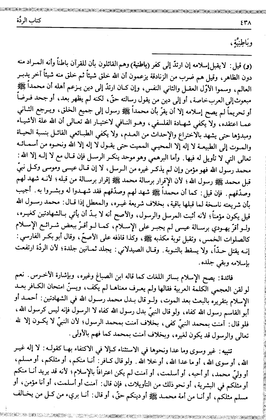 ـــــــــــــــــــــــــــــQ (وَ) قِيلَ: لَا يُقْبَلُ إسْلَامُهُ إنْ ارْتَدَّ إلَى كُفْرٍ (بَاطِنِيَّةٍ) وَهُمْ الْقَائِلُونَ بِأَنَّ لِلْقُرْآنِ بَاطِنًا وَأَنَّهُ الْمُرَادُ مِنْهُ دُونَ الظَّاهِرِ، وَقِيلَ هُمْ ضَرْبٌ مِنْ الزَّنَادِقَةِ يَزْعُمُونَ أَنَّ اللَّهَ خَلَقَ شَيْئًا ثُمَّ خَلَقَ مِنْهُ شَيْئًا آخَرَ يُدَبِّرُ الْعَالَمَ، وَسَمَّوْا الْأَوَّلَ الْعَقْلَ، وَالثَّانِيَ النَّفْسَ، وَإِنْ كَانَ ارْتَدَّ إلَى دِينٍ يَزْعُمُ أَهْلُهُ أَنَّ مُحَمَّدًا - صَلَّى اللَّهُ عَلَيْهِ وَسَلَّمَ - مَبْعُوثٌ إلَى الْعَرَبِ خَاصَّةً، أَوْ إلَى دِينِ مَنْ يَقُولُ رِسَالَتُهُ حَقٌّ، لَكِنَّهُ لَمْ يَظْهَرْ بَعْدُ، أَوَجَحَدَ فَرْضًا أَوْ تَحْرِيمًا لَمْ يَصِحَّ إسْلَامُهُ إلَّا أَنْ يُقِرَّ بِأَنَّ مُحَمَّدًا - صَلَّى اللَّهُ عَلَيْهِ وَسَلَّمَ - رَسُولٌ إلَى جَمِيعِ الْخَلْقِ، وَيَرْجِعُ الثَّانِي عَمَّا اعْتَقَدَهُ، وَلَا يَكْفِي شَهَادَةُ الْفَلْسَفِيِّ، وَهُوَ النَّافِي لِاخْتِيَارِ اللَّهِ تَعَالَى أَنَّ اللَّهَ عِلَّةُ الْأَشْيَاءِ وَمَبْدَؤُهَا حَتَّى يَشْهَدَ بِالِاخْتِرَاعِ وَالْإِحْدَاثِ مِنْ الْعَدَمِ، وَلَا يَكْفِي الطَّبَائِعِيُّ الْقَائِلُ بِنِسْبَةِ الْحَيَاةِ وَالْمَوْتِ إلَى الطَّبِيعَةِ لَا إلَهُ إلَّا الْمُحْيِي الْمُمِيتِ حَتَّى يَقُولَ لَا إلَهُ إلَّا اللَّهُ وَنَحْوُهُ مِنْ أَسْمَائِهِ تَعَالَى الَّتِي لَا تَأْوِيلَ لَهُ فِيهَا. وَأَمَّا الْبَرْهَمِيُّ وَهُوَ مُوَحِّدٌ يُنْكِرُ الرُّسُلَ فَإِنْ قَالَ مَعَ لَا إلَهُ إلَّا اللَّهُ: مُحَمَّدٌ رَسُولُ اللَّهِ فَهُوَ مُؤْمِنٌ وَإِنْ لَمْ يَذْكُرْ غَيْرَهُ مِنْ الرُّسُلِ، لَا إنْ قَالَ عِيسَى وَمُوسَى وَكُلُّ نَبِيٍّ قَبْلَ مُحَمَّدٍ - صَلَّى اللَّهُ عَلَيْهِ وَسَلَّمَ - رَسُولَ اللَّهِ؛ لِأَنَّ الْإِقْرَارَ بِرِسَالَةِ مُحَمَّدٍ - صَلَّى اللَّهُ عَلَيْهِ وَسَلَّمَ - إقْرَارٌ بِرِسَالَةِ مَنْ قَبْلَهُ؛ لِأَنَّهُ شَهِدَ لَهُمْ وَصَدَّقَهُمْ.