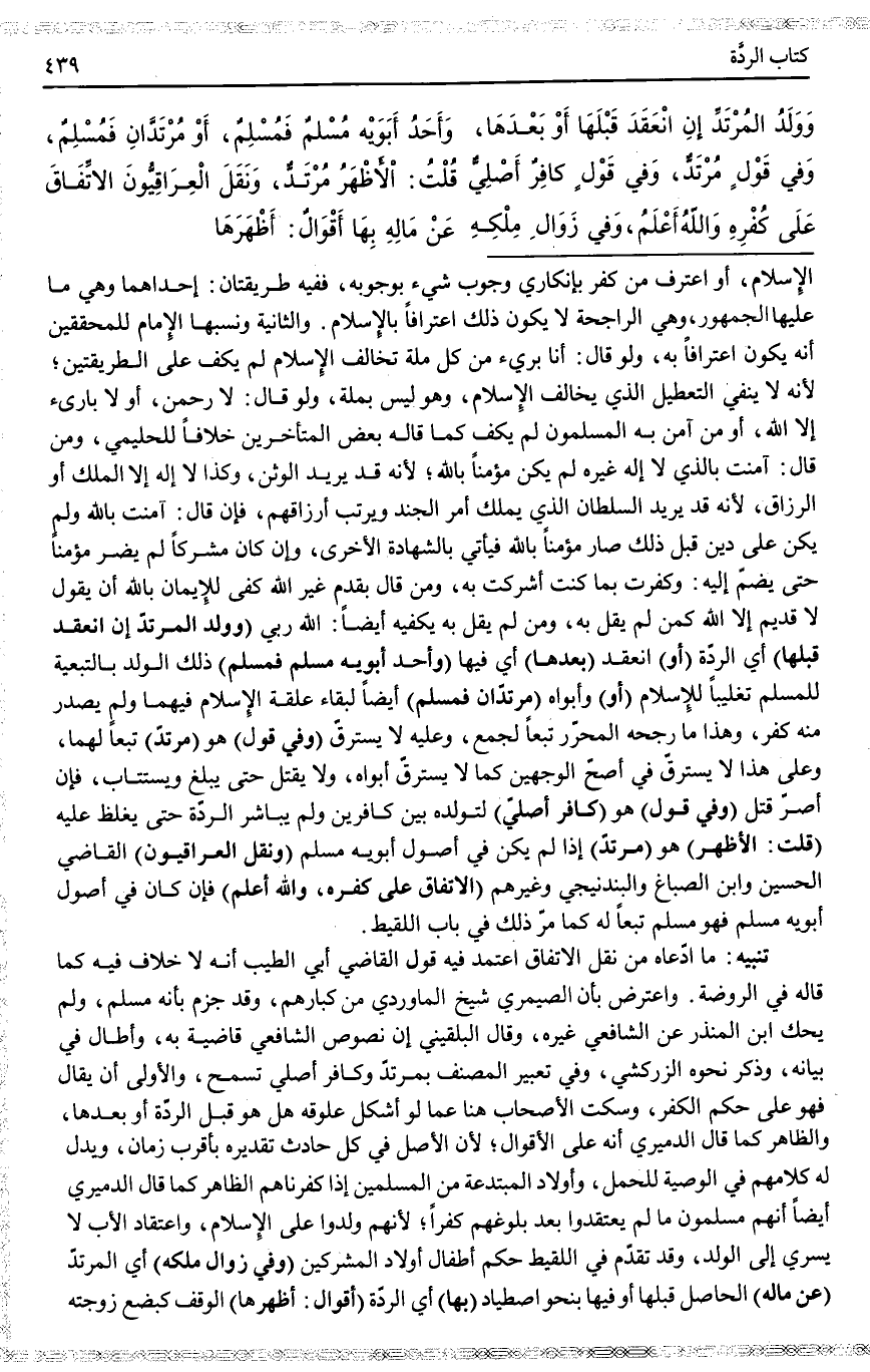 وَوَلَدُ الْمُرْتَدِّ إنْ انْعَقَدَ قَبْلَهَا أَوْ بَعْدَهَا، وَأَحَدُ أَبَوَيْهِ مُسْلِمٌ فَمُسْلِمٌ، أَوْ مُرْتَدَّانِ فَمُسْلِمٌ، وَفِي قَوْلٍ مُرْتَدٌّ، وَفِي قَوْلٍ كَافِرٌ أَصْلِيٌّ قُلْتُ: الْأَظْهَرُ مُرْتَدٌّ، وَنَقَلَ الْعِرَاقِيُّونَ الِاتِّفَاقَ عَلَى كُفْرِهِ، وَاَللَّهُ أَعْلَمُ،