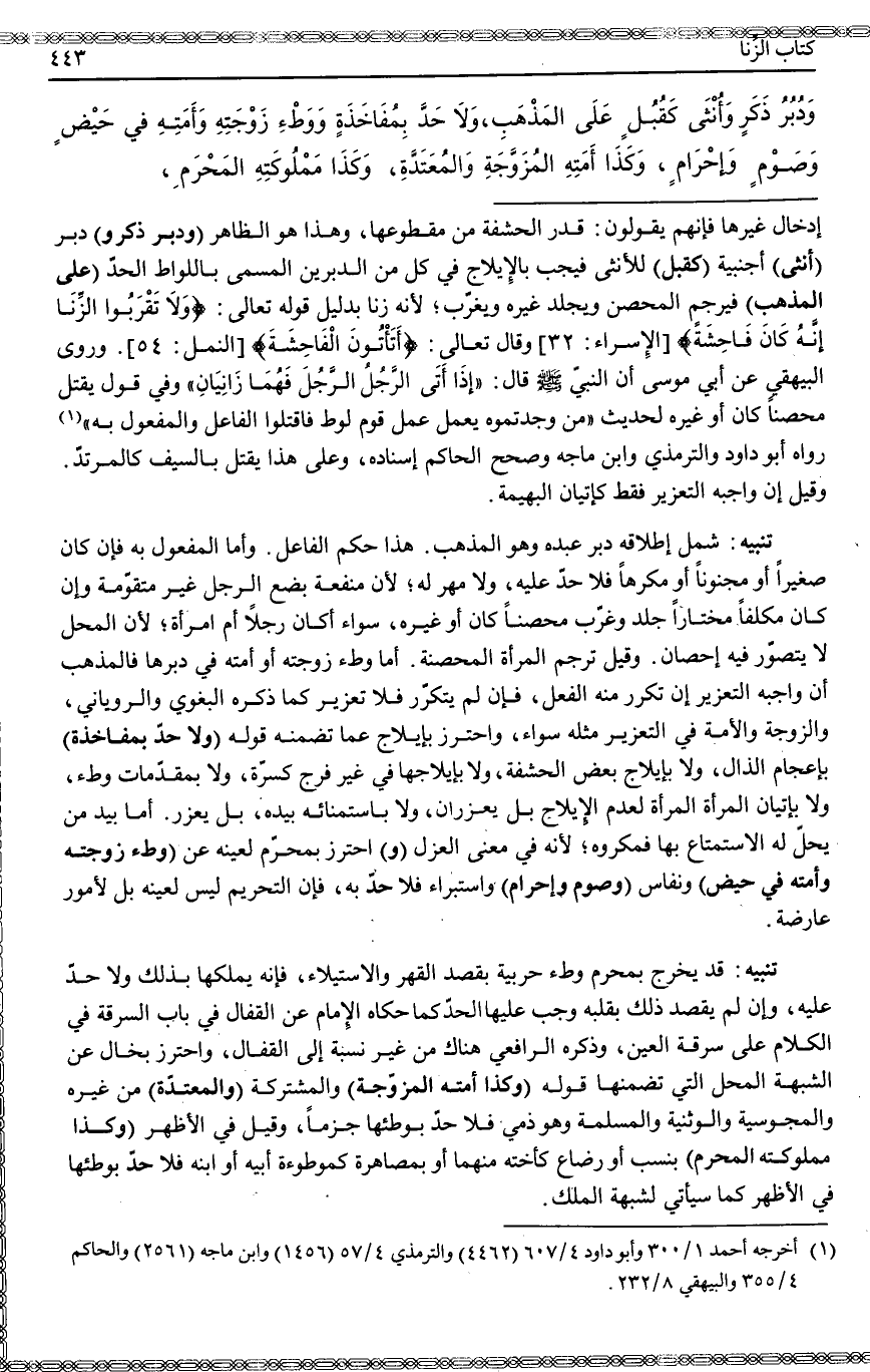 تَنْبِيهٌ: شَمِلَ إطْلَاقُهُ دُبُرَ عَبْدِهِ وَهُوَ الْمَذْهَبُ. هَذَا حُكْمُ الْفَاعِلِ. وَأَمَّا الْمَفْعُولِ بِهِ فَإِنْ كَانَ صَغِيرًا أَوْ مَجْنُونًا أَوْ مُكْرَهًا فَلَا حَدَّ عَلَيْهِ، وَلَا مَهْرَ لَهُ؛ لِأَنَّ مَنْفَعَةَ بُضْعِ الرَّجُلِ غَيْرُ مُتَقَوِّمَةٍ وَإِنْ كَانَ مُكَلَّفًا مُخْتَارًا جُلِدَ وَغُرِّبَ مُحْصَنًا كَانَ أَوْ غَيْرَهُ، سَوَاءٌ أَكَانَ رَجُلًا أَمْ امْرَأَةً؛ لِأَنَّ الْمَحَلَّ لَا يُتَصَوَّرُ فِيهِ إحْصَانٌ. وَقِيلَ تُرْجَمُ الْمَرْأَةُ الْمُحْصَنَةُ. أَمَّا وَطْءُ زَوْجَتِهِ أَوْ أَمَتِهِ فِي دُبُرِهَا فَالْمَذْهَبُ أَنَّ وَاجِبَهُ التَّعْزِيرُ إنْ تَكَرَّرَ مِنْهُ الْفِعْلُ، فَإِنْ لَمْ يَتَكَرَّرْ فَلَا تَعْزِيرَ كَمَا ذَكَرَهُ الْبَغَوِيّ وَالرُّويَانِيُّ، وَالزَّوْجَةُ وَالْأَمَةُ فِي التَّعْزِيرِ مِثْلُهُ سَوَاءٌ، وَاحْتُرِزَ بِإِيلَاجٍ عَمَّا تَضَمَّنَهُ قَوْلُهُ (وَلَا حَدَّ بِمُفَاخَذَةٍ) بِإِعْجَامِ الذَّالِ، وَلَا بِإِيلَاجِ بَعْضِ الْحَشَفَةِ، وَلَا بِإِيلَاجِهَا فِي غَيْرِ فَرْجٍ كَسُرَّةٍ، وَلَا بِمُقَدَّمَاتِ وَطْءٍ، وَلَا بِإِتْيَانِ الْمَرْأَةِ الْمَرْأَةَ لِعَدَمِ الْإِيلَاجِ يُعَزَّرَانِ، وَلَا بِاسْتِمْنَائِهِ بِيَدِهِ، بَلْ يُعَزَّرُ. أَمَّا بِيَدِ مَنْ يَحِلُّ لَهُ الِاسْتِمْتَاعُ بِهَا فَمَكْرُوهٌ؛ لِأَنَّهُ فِي مَعْنَى الْعَزْلِ (وَ) اُحْتُرِزَ بِمُحَرَّمٍ لِعَيْنِهِ عَنْ (وَطْءِ زَوْجَتِهِ وَأَمَتِهِ فِي حَيْضٍ) وَنِفَاسٍ (وَصَوْمٍ وَإِحْرَامٍ) وَاسْتِبْرَاءٍ فَلَا حَدَّ بِهِ، فَإِنَّ التَّحْرِيمَ لَيْسَ لِعَيْنِهِ بَلْ لِأُمُورٍ عَارِضَةٍ.
