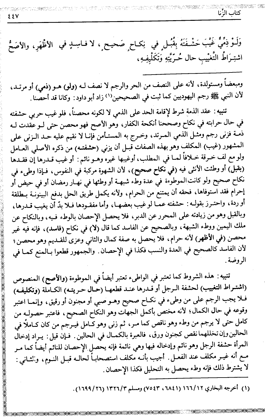 تَنْبِيهٌ: عَقْدُ الذِّمَّةِ شَرْطٌ لِإِقَامَةِ الْحَدِّ عَلَى الذِّمِّيِّ لَا لِكَوْنِهِ مُحْصَنًا، فَلَوْ غَيَّبَ حَرْبِيٌّ حَشَفَتَهُ فِي حَالِ حِرَابَتِهِ فِي نِكَاحٍ وَصَحَّحْنَا أَنْكِحَةَ الْكُفَّارِ، وَهُوَ الْأَصَحُّ فَهُوَ مُحْصَنٌ حَتَّى لَوْ عُقِدَتْ لَهُ ذِمَّةٌ فَزَنَى رُجِمَ وَمِثْلُ الذِّمِّيِّ الْمُرْتَدُّ، وَخَرَجَ بِهِ الْمُسْتَأْمَنُ فَإِنَّا لَا نُقِيمُ عَلَيْهِ حَدَّ الزِّنَى عَلَى الْمَشْهُورِ (غَيَّبَ) الْمُكَلَّفُ وَهُوَ بِهَذِهِ الصِّفَاتِ قَبْلَ أَنْ يَزْنِيَ (حَشَفَتَهُ) مِنْ ذَكَرِهِ الْأَصْلِيِّ الْعَامِلِ وَلَوْ مَعَ لَفِّ خِرْقَةٍ خِلَافًا لِمَا فِي الْمَطْلَبِ، أَوْ غَيَّبَهَا غَيْرُهُ وَهُوَ نَائِمٌ: أَوْ غَيَّبَ قَدْرَهَا إنْ فَقَدَهَا (بِقُبُلٍ) أَوْ وَطِئَتْ الْأُنْثَى فِيهِ (فِي نِكَاحٍ صَحِيحٍ) ، لِأَنَّ الشَّهْوَةَ مُرَكَّبَةٌ فِي النُّفُوسِ، فَإِذَا وَطِئَ فِي نِكَاحٍ صَحِيحٍ وَلَوْ كَانَتْ الْمَوْطُوءَةُ فِي عِدَّةِ وَطْءِ شُبْهَةٍ أَوْ وَطِئَهَا فِي نَهَارِ رَمَضَانَ أَوْ فِي حَيْضٍ أَوْ إحْرَامٍ فَقَدْ اسْتَوْفَاهَا، فَحَقُّهُ أَنْ يَمْتَنِعَ مِنْ الْحَرَامِ، وَلِأَنَّهُ يَكْمُلُ طَرِيقُ الْحِلِّ بِدَفْعِ الْبَيْنُونَةِ بِطَلْقَةٍ أَوْ رِدَّةٍ، وَاحْتُرِزَ بِقَوْلِهِ: حَشَفَتَهُ عَمَّا لَوْ غَيَّبَ بَعْضَهَا، وَأَمَّا مَفْقُودُهَا فَلَا بُدَّ أَنْ يُغَيِّبَ قَدْرَهَا، وَبِالْقُبُلِ وَهُوَ مِنْ زِيَادَتِهِ عَلَى الْمُحَرَّرِ عَنْ الدُّبُرِ، فَلَا يَحْصُلُ الْإِحْصَانُ بِالْوَطْءِ فِيهِ، وَبِالنِّكَاحِ عَنْ مِلْكِ الْيَمِينِ وَوَطْءِ الشُّبْهَةِ، وَبِالصَّحِيحِ عَنْ الْفَاسِدِ كَمَا قَالَ (لَا) فِي نِكَاحٍ (فَاسِدٍ) ، فَإِنَّهُ فِيهِ غَيْرُ مُحْصَنٍ (فِي الْأَظْهَرِ) لِأَنَّهُ حَرَامٌ، فَلَا يَحْصُلُ بِهِ صِفَةُ كَمَالٍ وَالثَّانِي وَعُزِيَ لِلْقَدِيمِ وَهُوَ مُحْصَنٌ؛ لِأَنَّ الْفَاسِدَ كَالصَّحِيحِ فِي الْعِدَّةِ وَالنَّسَبِ فَكَذَا فِي الْإِحْصَانِ. وَالْجُمْهُورُ قَطَعُوا بِالْمَنْعِ كَمَا فِي الرَّوْضَةِ.