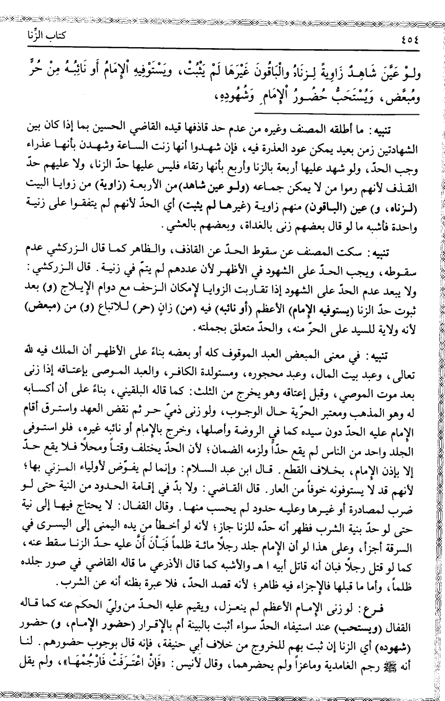 تَنْبِيهٌ: سَكَتَ الْمُصَنِّفُ عَنْ سُقُوطِ الْحَدِّ عَنْ الْقَاذِفِ، وَالظَّاهِرُ كَمَا قَالَ الزَّرْكَشِيُّ عَدَمُ سُقُوطِهِ، وَيَجِبُ الْحَدُّ عَلَى الشُّهُودِ فِي الْأَظْهَرِ لِأَنَّ عَدَدَهُمْ لَمْ يُتِمَّ فِي زَنْيَةٍ. قَالَ الزَّرْكَشِيُّ: وَلَا يَبْعُدُ عَدَمُ الْحَدِّ عَلَى الشُّهُودِ إذَا تَقَارَبَتْ الزَّوَايَا لِإِمْكَانِ الزَّحْفِ مَعَ دَوَامِ الْإِيلَاجِ (وَ) بَعْدَ ثُبُوتِ حَدِّ الزِّنَا (يَسْتَوْفِيهِ الْإِمَامُ) الْأَعْظَمُ (أَوْ نَائِبُهُ) فِيهِ (مِنْ) زَانٍ (حُرٍّ) لِلِاتِّبَاعِ (وَ) مِنْ (مُبَعَّضٍ) لِأَنَّهُ وِلَايَةٌ لِلسَّيِّدِ عَلَى الْحُرِّ مِنْهُ، وَالْحَدُّ مُتَعَلِّقٌ بِجُمْلَتِهِ.