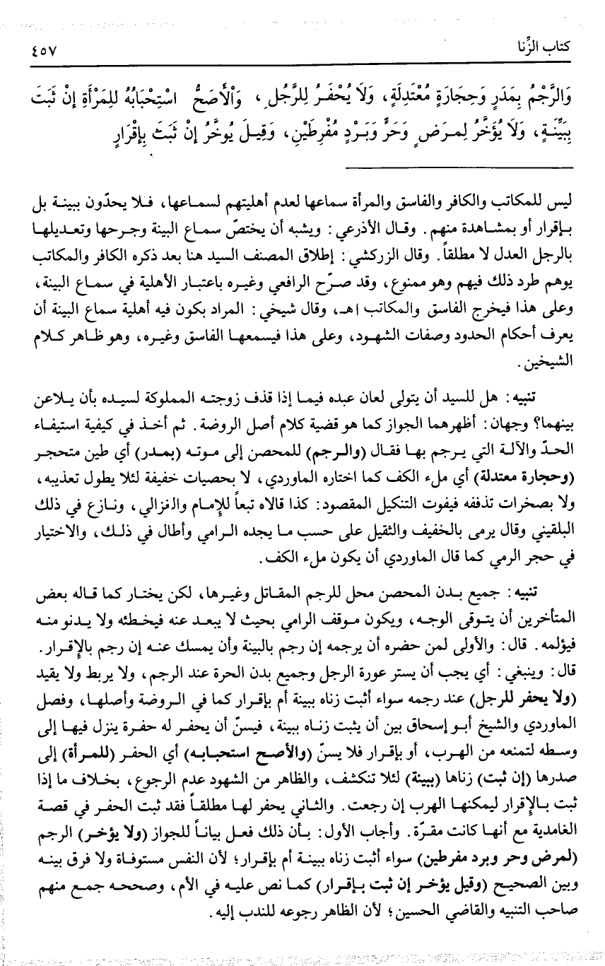 وَالرَّجْمُ بِمَدَرٍ وَحِجَارَةٍ مُعْتَدِلَةٍ، وَلَا يُحْفَرُ لِلرَّجُلِ، وَالْأَصَحُّ اسْتِحْبَابُهُ لِلْمَرْأَةِ إنْ ثَبَتَ بِبَيِّنَةٍ، وَلَا يُؤَخَّرُ لِمَرَضٍ وَحَرٍّ وَبَرْدٍ مُفْرِطَيْنِ، وَقِيلَ يُؤَخَّرُ إنْ ثَبَتَ بِإِقْرَارٍ