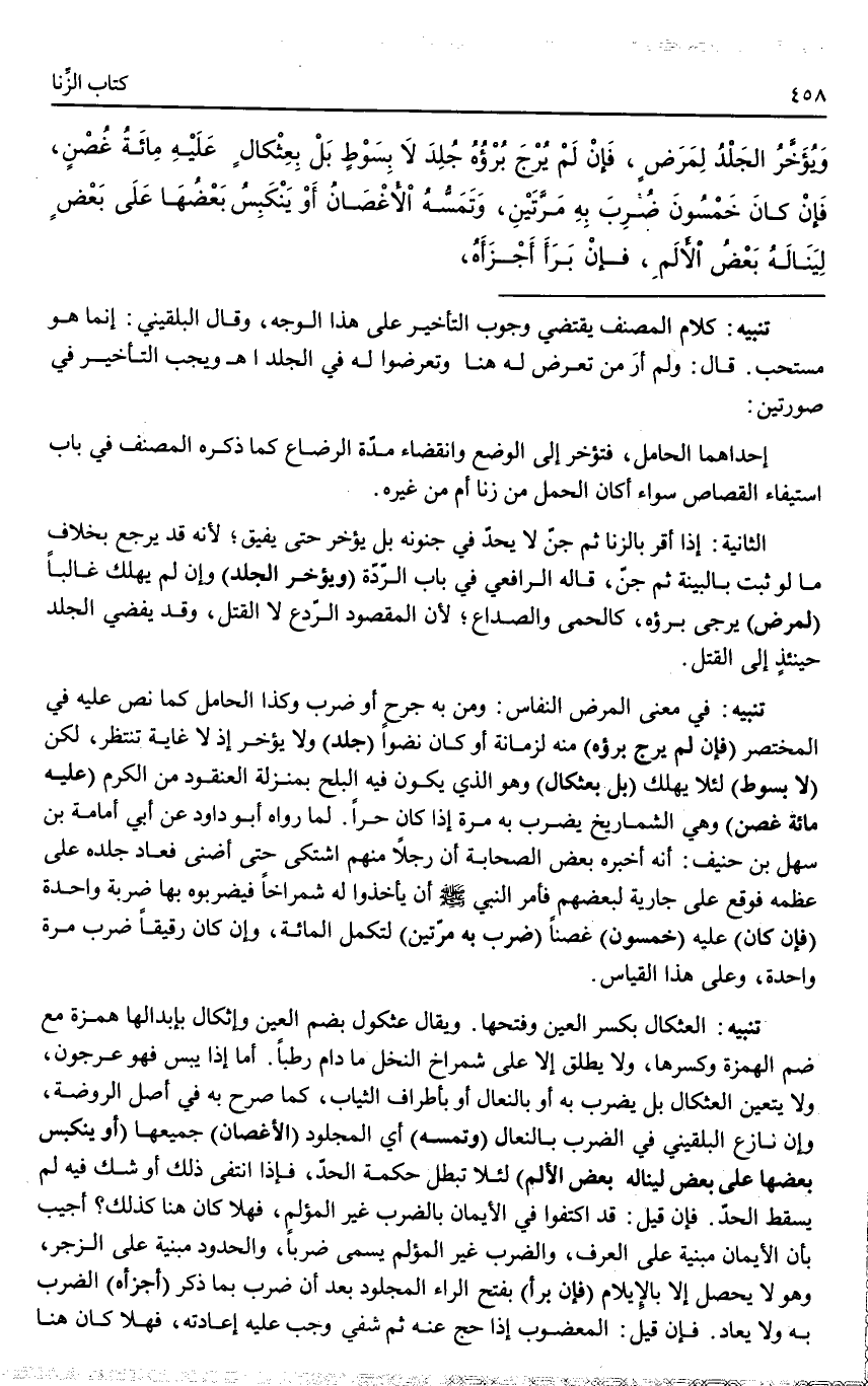 تَنْبِيهٌ: فِي مَعْنَى الْمَرَضِ النِّفَاسُ: وَمَنْ بِهِ جُرْحٌ أَوْ ضَرْبٌ وَكَذَا الْحَامِلُ كَمَا نَصَّ عَلَيْهِ فِي الْمُخْتَصَرِ (فَإِنْ لَمْ يُرْجَ بُرْؤُهُ) مِنْهُ لِزَمَانَةٍ أَوْ كَانَ نِضْوًا (جُلِدَ) وَلَا يُؤَخَّرُ إذْ لَا غَايَةَ تُنْتَظَرُ، لَكِنْ (لَا بِسَوْطٍ) لِئَلَّا يَهْلِكَ (بَلْ بِعِثْكَالٍ) وَهُوَ الَّذِي يَكُونُ فِيهِ الْبَلَحُ بِمَنْزِلَةِ الْعُنْقُودِ مِنْ الْكَرْمِ (عَلَيْهِ مِائَةُ غُصْنٍ) وَهِيَ الشَّمَارِيخُ يُضْرَبُ بِهِ مَرَّةً إذَا كَانَ حُرًّا. لِمَا رَوَاهُ أَبُو دَاوُد عَنْ أَبِي أُمَامَةَ بْنِ سَهْلِ بْنِ حُنَيْفٍ: أَنَّهُ أَخْبَرَهُ بَعْضُ الصَّحَابَةِ أَنَّ رَجُلًا مِنْهُمْ اشْتَكَى حَتَّى أَضْنَى فَعَادَ جِلْدُهُ عَلَى عَظْمِهِ فَوَقَعَ عَلَى جَارِيَةٍ لِبَعْضِهِمْ فَأَمَرَ النَّبِيُّ - صَلَّى اللَّهُ عَلَيْهِ وَسَلَّمَ - أَنْ يَأْخُذُوا لَهُ شِمْرَاخًا فَيَضْرِبُوهُ بِهَا ضَرْبَةً وَاحِدَةً (فَإِنْ كَانَ) عَلَيْهِ (خَمْسُونَ) غُصْنًا (ضُرِبَ بِهِ مَرَّتَيْنِ) لِتَكْمُلَ الْمِائَةُ، وَإِنْ كَانَ رَقِيقًا ضُرِبَ مَرَّةً وَاحِدَةً، وَعَلَى هَذَا الْقِيَاسِ.