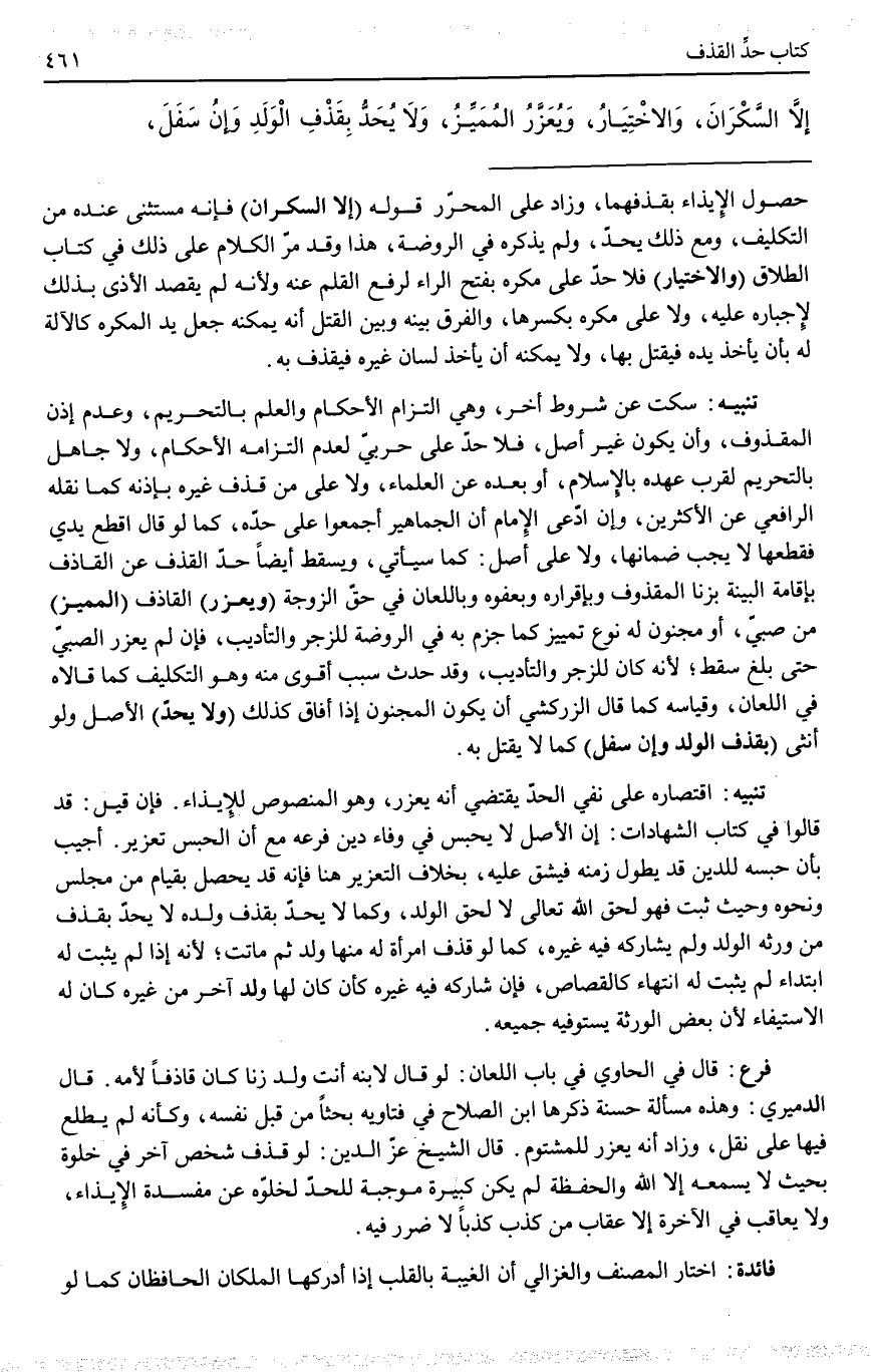 فَرْعٌ: قَالَ فِي الْحَاوِي فِي بَابِ اللِّعَانِ: لَوْ قَالَ لِابْنِهِ أَنْتَ وَلَدُ زِنًا كَانَ قَاذِفًا لِأُمِّهِ. قَالَ الدَّمِيرِيُّ: وَهَذِهِ مَسْأَلَةٌ حَسَنَةٌ ذَكَرَهَا ابْنُ الصَّلَاحِ فِي فَتَاوِيهِ بَحْثًا مِنْ قِبَلِ نَفْسِهِ، وَكَأَنَّهُ لَمْ يَطَّلِعْ فِيهَا عَلَى نَقْلٍ، وَزَادَ أَنَّهُ يُعَزَّرُ لِلْمَشْتُومِ. قَالَ الشَّيْخُ عِزُّ الدِّينِ: لَوْ قَذَفَ شَخْصٌ آخَرَ فِي خَلْوَةٍ بِحَيْثُ لَا يَسْمَعُهُ إلَّا اللَّهُ وَالْحَفَظَةُ لَمْ يَكُنْ كَبِيرَةً مُوجِبَةً لِلْحَدِّ لِخُلُوِّهِ عَنْ مَفْسَدَةِ الْإِيذَاءِ، وَلَا يُعَاقَبُ فِي الْآخِرَةِ إلَّا عِقَابَ مَنْ كَذَبَ كِذْبًا لَا ضَرَرَ فِيهِ. فَائِدَةٌ: اخْتَارَ الْمُصَنِّفُ وَالْغَزَالِيُّ أَنَّ الْغَيْبَةَ بِالْقَلْبِ إذَا أَدْرَكَهَا الْمَلَكَانِ الْحَافِظَانِ كَمَا لَوْ