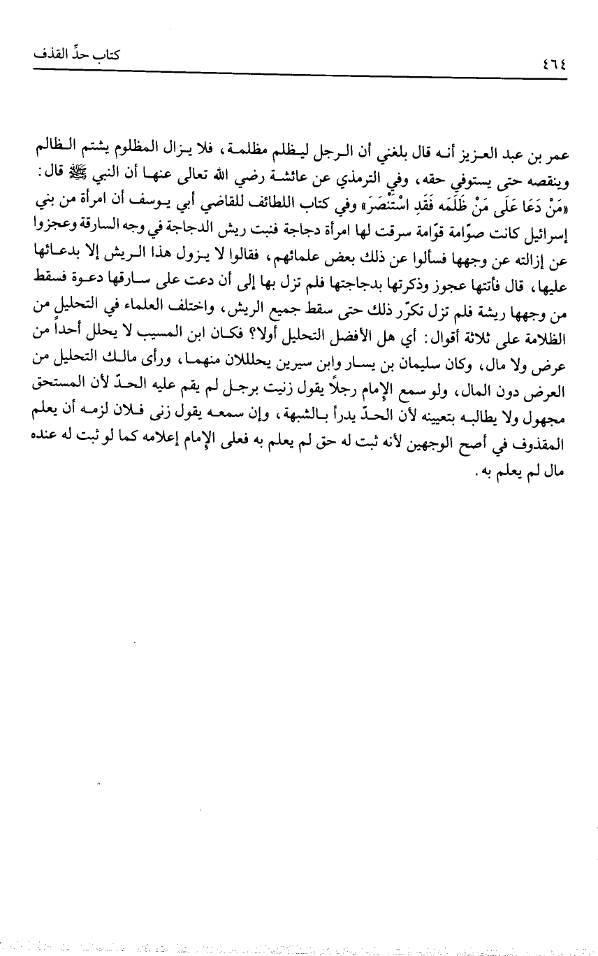 ـــــــــــــــــــــــــــــQعُمَرَ بْنِ عَبْدِ الْعَزِيزِ أَنَّهُ قَالَ بَلَغَنِي أَنَّ الرَّجُلَ لِيَظْلِمَ مَظْلَمَةً، فَلَا يَزَالُ الْمَظْلُومُ يَشْتِمُ الظَّالِمَ وَيُنْقِصُهُ حَتَّى يَسْتَوْفِيَ حَقَّهُ، وَفِي التِّرْمِذِيِّ عَنْ عَائِشَةَ - رَضِيَ اللَّهُ تَعَالَى عَنْهَا - أَنَّ النَّبِيَّ - صَلَّى اللَّهُ عَلَيْهِ وَسَلَّمَ - قَالَ: «مَنْ دَعَا عَلَى مَنْ ظَلَمَهُ فَقَدْ اسْتَنْصَرَ» وَفِي كِتَابِ اللَّطَائِفِ لِلْقَاضِي أَبِي يُوسُفَ أَنَّ امْرَأَةً مِنْ بَنِي إسْرَائِيلَ كَانَتْ صَوَّامَةً قَوَّامَةً سَرَقَتْ لَهَا امْرَأَةٌ دَجَاجَةً فَنَبَتَ رِيشُ الدَّجَاجَةِ فِي وَجْهِ السَّارِقَةِ وَعَجَزُوا عَنْ إزَالَتِهِ عَنْ وَجْهِهَا فَسَأَلُوا عَنْ ذَلِكَ بَعْضَ عُلَمَائِهِمْ، فَقَالُوا لَا يَزُولُ هَذَا الرِّيشُ إلَّا بِدُعَائِهَا عَلَيْهَا، قَالَ فَأَتَتْهَا عَجُوزٌ وَذَكَّرَتْهَا بِدَجَاجَتِهَا فَلَمْ تَزَلْ بِهَا إلَى أَنْ دَعَتْ عَلَى سَارِقِهَا دَعْوَةً فَسَقَطَ مِنْ وَجْهِهَا رِيشَةٌ فَلَمْ تَزَلْ تُكَرِّرُ ذَلِكَ حَتَّى سَقَطَ جَمِيعُ الرِّيشِ، وَاخْتَلَفَ الْعُلَمَاءُ فِي التَّحْلِيلِ مِنْ الظُّلَامَةِ عَلَى ثَلَاثَةِ أَقْوَالٍ: أَيْ: هَلْ الْأَفْضَلُ التَّحْلِيلُ أَوْ لَا؟ فَكَانَ ابْنُ الْمُسَيِّبِ لَا يُحَلِّلُ أَحَدًا مِنْ عِرْضٍ وَلَا مَالٍ، وَكَانَ سُلَيْمَانُ بْنُ يَسَارٍ وَابْنُ سِيرِينَ يُحَلِّلَانِ مِنْهُمَا، وَرَأَى مَالِكٌ التَّحْلِيلَ مِنْ الْعِرْضِ دُونَ الْمَالِ، وَلَوْ سَمِعَ الْإِمَامُ رَجُلًا يَقُولُ زَنَيْتُ بِرَجُلٍ لَمْ يُقِمْ عَلَيْهِ الْحَدَّ لِأَنَّ الْمُسْتَحَقَّ مَجْهُولٌ وَلَا يُطَالِبُهُ بِتَعْيِينِهِ لِأَنَّ الْحَدَّ يُدْرَأُ بِالشُّبْهَةِ، وَإِنْ سَمِعَهُ يَقُولُ زَنَى فُلَانٌ لَزِمَهُ أَنْ يَعْلَمَ الْمَقْذُوفَ فِي أَصَحِّ الْوَجْهَيْنِ لِأَنَّهُ ثَبَتَ لَهُ حَقٌّ لَمْ يَعْلَمْ بِهِ فَعَلَى الْإِمَامِ إعْلَامُهُ كَمَا لَوْ ثَبَتَ لَهُ عِنْدَهُ مَالٌ لَمْ يَعْلَمْ بِهِ.