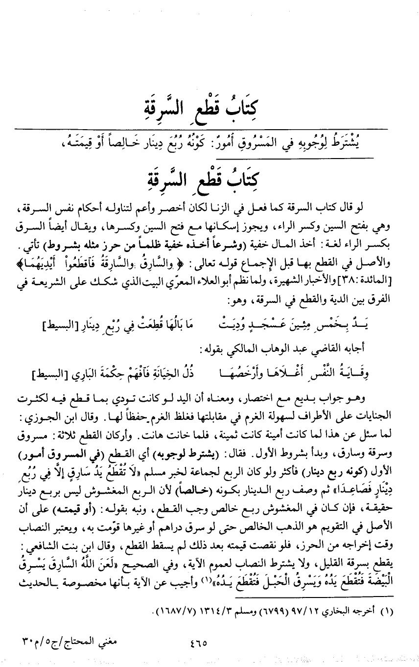 كِتَابُ قَطْعِ السَّرِقَةِ يُشْتَرَطُ لِوُجُوبِهِ فِي الْمَسْرُوقِ أُمُورٌ: كَوْنُهُ رُبُعَ دِينَارٍ خَالِصًا أَوْ قِيمَتَهُ،