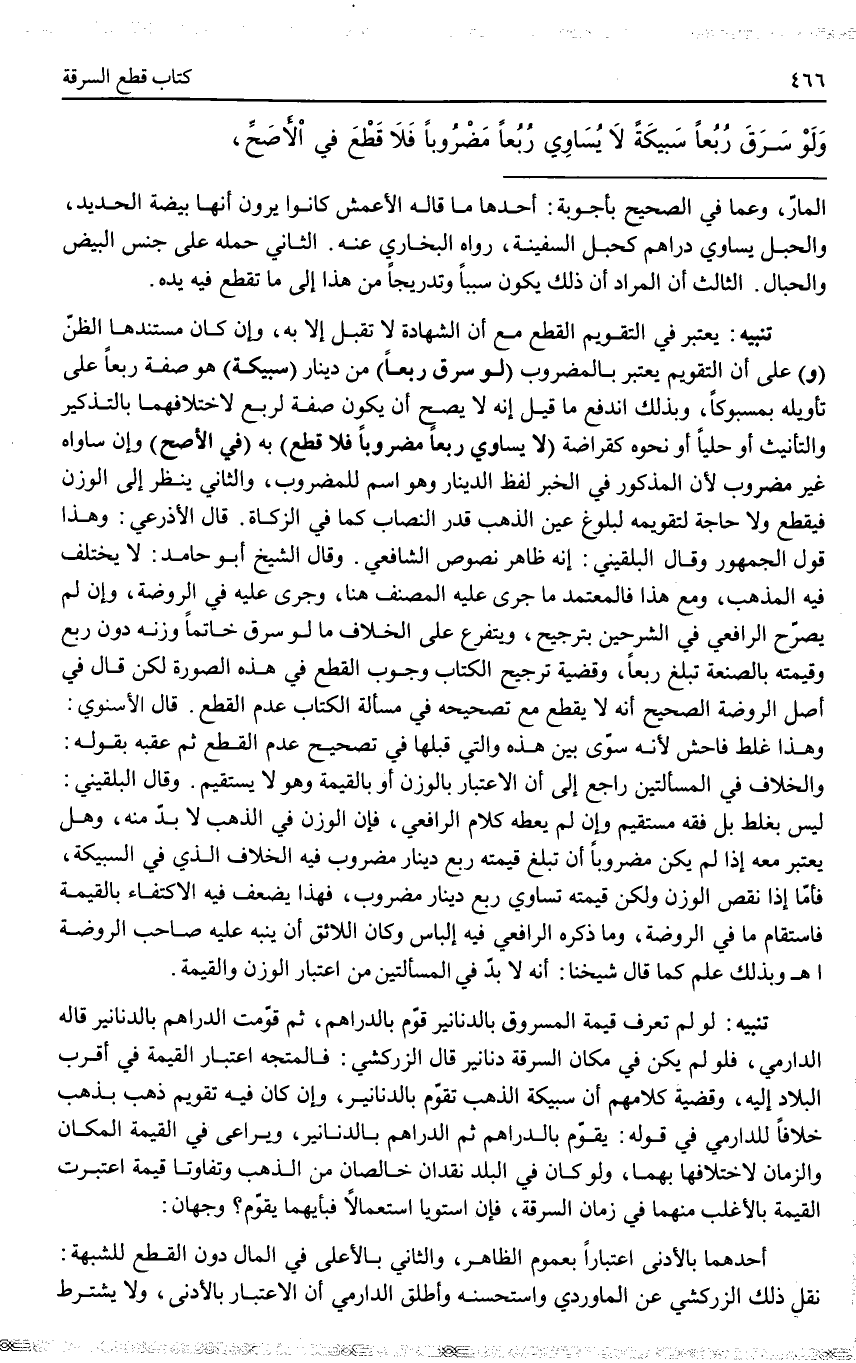 قَالَ الْإِسْنَوِيُّ: وَهَذَا غَلَطٌ فَاحِشٌ لِأَنَّهُ سَوَّى بَيْنَ هَذِهِ وَاَلَّتِي قَبْلَهَا فِي تَصْحِيحِ عَدَمِ الْقَطْعِ ثُمَّ عَقَّبَهُ بِقَوْلِهِ: وَالْخِلَافُ فِي الْمَسْأَلَتَيْنِ رَاجِعٌ إلَى أَنَّ الِاعْتِبَارَ بِالْوَزْنِ أَوْ بِالْقِيمَةِ وَهُوَ لَا يَسْتَقِيمُ. وَقَالَ الْبُلْقِينِيُّ: لَيْسَ بِغَلَطٍ بَلْ فِقْهٌ مُسْتَقِيمٌ، وَإِنْ لَمْ يُعْطِهِ كَلَامُ الرَّافِعِيِّ، فَإِنَّ الْوَزْنَ فِي الذَّهَبِ لَا بُدَّ مِنْهُ، وَهَلْ يُعْتَبَرُ مَعَهُ إذَا لَمْ يَكُنْ مَضْرُوبًا أَنْ تَبْلُغَ قِيمَتُهُ رُبُعَ دِينَارٍ مَضْرُوبٍ فِيهِ الْخِلَافُ الَّذِي فِي السَّبِيكَةِ، فَأَمَّا إذَا نَقَصَ الْوَزْنُ وَلَكِنَّ قِيمَتَهُ تُسَاوِي رُبُعَ دِينَارٍ مَضْرُوبٍ، فَهَذَا يَضْعُفُ فِيهِ الِاكْتِفَاءَ بِالْقِيمَةِ فَاسْتَقَامَ مَا فِي الرَّوْضَةِ، وَمَا ذَكَرَهُ الرَّافِعِيُّ فِيهِ إلْبَاسٌ وَكَانَ اللَّائِقُ أَنْ يُنَبِّهَ عَلَيْهِ صَاحِبُ الرَّوْضَةِ اهـ وَبِذَلِكَ عُلِمَ كَمَا قَالَ شَيْخُنَا: أَنَّهُ لَا بُدَّ فِي الْمَسْأَلَتَيْنِ مِنْ اعْتِبَارِ الْوَزْنِ وَالْقِيمَةِ.
