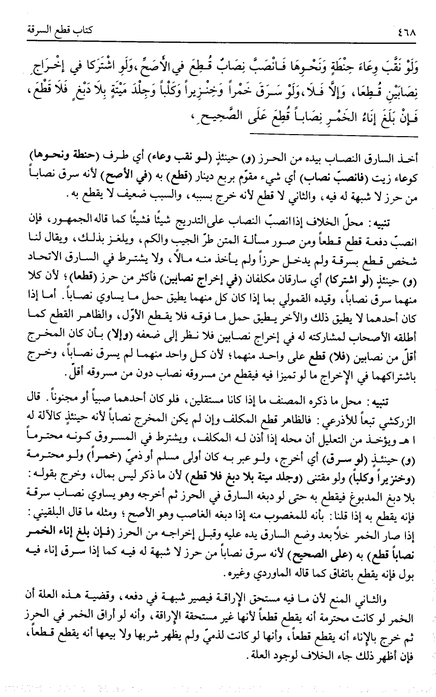 تَنْبِيهٌ مَحَلُّ الْخِلَافِ إذَا انْصَبَّ النِّصَابُ عَلَى التَّدْرِيجِ شَيْئًا فَشَيْئًا كَمَا قَالَهُ الْجُمْهُورُ، فَإِنْ انْصَبَّ دَفْعَةً قُطِعَ قَطْعًا وَمِنْ صُوَرِ مَسْأَلَةِ الْمَتْنِ طَرُّ الْجَيْبِ وَالْكُمِّ، وَيُلْغَزُ بِذَلِكَ، وَيُقَالُ لَنَا شَخْصٌ قُطِعَ بِسَرِقَةٍ وَلَمْ يَدْخُلْ حِرْزًا وَلَمْ يَأْخُذْ مِنْهُ مَالًا، وَلَا يُشْتَرَطُ فِي السَّارِقِ الِاتِّحَادُ.