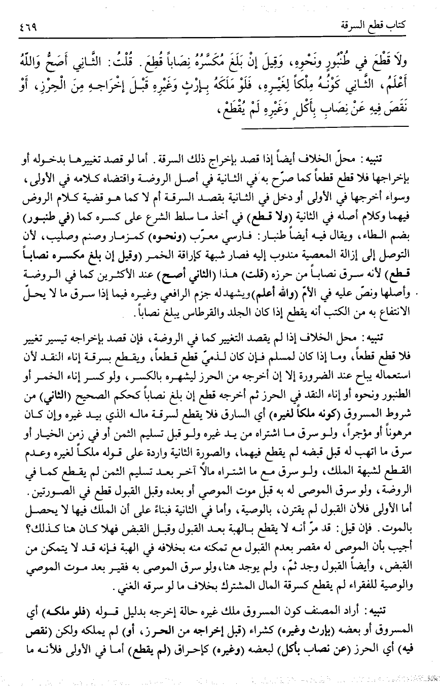 (وَلَا قَطْعَ) فِي أَخْذِ مَا سَلَّطَ الشَّرْعُ عَلَى كَسْرِهِ كَمَا (فِي طُنْبُورٍ) بِضَمِّ الطَّاءِ، وَيُقَالُ فِيهِ أَيْضًا طِنْبَارٌ: فَارِسِيٌّ مُعَرَّبٌ (وَنَحْوِهِ) كَمِزْمَارٍ وَصَنَمٍ وَصَلِيبٍ، لِأَنَّ التَّوَصُّلَ إلَى إزَالَةِ الْمَعْصِيَةِ مَنْدُوبٌ إلَيْهِ فَصَارَ شُبْهَةً كَإِرَاقَةِ الْخَمْرِ (وَقِيلَ: إنْ بَلَغَ مُكَسَّرُهُ نِصَابًا قُطِعَ) لِأَنَّهُ سَرَقَ نِصَابًا مِنْ حِرْزِهِ (قُلْت) هَذَا (الثَّانِي أَصَحُّ) عِنْدَ الْأَكْثَرِينَ كَمَا فِي الرَّوْضَةِ وَأَصْلِهَا وَنَصَّ عَلَيْهِ فِي الْأُمِّ (وَاَللَّهُ أَعْلَمُ) . وَيَشْهَدُ لَهُ جَزْمُ الرَّافِعِيِّ وَغَيْرِهِ فِيمَا إذَا سَرَقَ مَا لَا يَحِلُّ الِانْتِفَاعُ بِهِ مِنْ الْكُتُبِ أَنَّهُ يُقْطَعُ إذَا كَانَ الْجِلْدُ وَالْقِرْطَاسُ يَبْلُغُ نِصَابًا.
