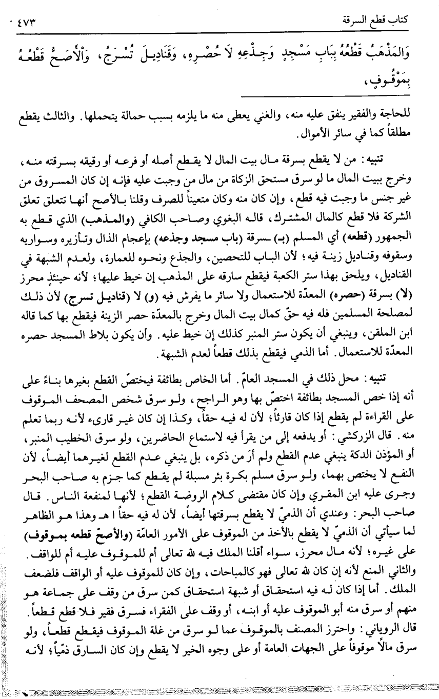 قَالَهُ الْبَغَوِيّ وَصَاحِبُ الْكَافِي (وَالْمَذْهَبُ) الَّذِي قَطَعَ بِهِ الْجُمْهُورُ (قَطْعُهُ) أَيْ: الْمُسْلِمِ (بِ) سَرِقَةِ (بَابِ مَسْجِدٍ وَجِذْعِهِ) بِإِعْجَامِ الذَّالِ وَتَأْزِيرِهِ وَسَوَارِيهِ وَسُقُوفِهِ وَقَنَادِيلَ زِينَةٍ فِيهِ؛ لِأَنَّ الْبَابَ لِلتَّحْصِينِ، وَالْجِذْعَ وَنَحْوَهُ لِلْعِمَارَةِ، وَلِعَدَمِ الشُّبْهَةِ فِي الْقَنَادِيلِ، وَيَلْحَقُ بِهَذَا سِتْرُ الْكَعْبَةِ فَيُقْطَعُ سَارِقُهُ عَلَى الْمَذْهَبِ إنْ خِيطَ عَلَيْهَا؛ لِأَنَّهُ حِينَئِذٍ مُحْرِزٌ (لَا) بِسَرِقَةِ (حُصْرِهِ) الْمُعَدَّةِ لِلِاسْتِعْمَالِ وَلَا سَائِرِ مَا يُفْرَشُ فِيهِ (وَ) لَا (قَنَادِيلَ تُسْرَجُ) لِأَنَّ ذَلِكَ لِمَصْلَحَةِ الْمُسْلِمِينَ فَلَهُ فِيهِ حَقٌّ كَمَالِ بَيْتِ الْمَالِ وَخَرَجَ بِالْمُعَدَّةِ حُصْرُ الزِّينَةِ فَيُقْطَعُ بِهَا كَمَا قَالَهُ ابْنُ الْمُلَقَّنِ، وَيَنْبَغِي أَنْ يَكُونَ سِتْرُ الْمِنْبَرِ كَذَلِكَ إنْ خِيطَ عَلَيْهِ. وَأَنْ يَكُونَ بَلَاطَ الْمَسْجِدِ حُصْرَهُ الْمُعَدَّةَ لِلِاسْتِعْمَالِ. أَمَّا الذِّمِّيُّ فَيُقْطَعُ بِذَلِكَ قَطْعًا لِعَدَمِ الشُّبْهَةِ.