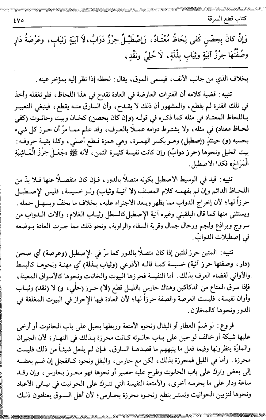 تَنْبِيهٌ قَضِيَّةُ كَلَامِهِ أَنَّ الْفَتَرَاتِ الْعَارِضَةَ فِي الْعَادَةِ تَقْدَحُ فِي هَذَا اللِّحَاظِ، فَلَوْ تُغْفِلُهُ وَأَخَذَ فِي تِلْكَ الْفَتْرَةِ لَمْ يُقْطَعْ، وَالْمَشْهُورُ أَنَّ ذَلِكَ لَا يَقْدَحُ، وَأَنَّ السَّارِقَ مِنْهُ يُقْطَعُ، فَيَنْبَغِي التَّعْبِيرُ بِاللِّحَاظِ الْمُعْتَادِ فِي مِثْلِهِ كَمَا ذَكَرَهُ فِي قَوْلِهِ (وَإِنْ كَانَ بِحِصْنٍ) كَخَانٍ وَبَيْتٍ وَحَانُوتٍ (كَفَى لِحَاظٌ مُعْتَادٌ) فِي مِثْلِهِ، وَلَا يُشْتَرَطُ دَوَامُهُ عَمَلًا بِالْعُرْفِ، وَقَدْ عُلِمَ مِمَّا مَرَّ أَنَّ حِرْزَ كُلِّ شَيْءٍ بِحَسَبِهِ (وَ) حِينَئِذٍ (إصْطَبْلٌ) وَهُوَ بِكَسْرِ الْهَمْزَةِ، وَهِيَ هَمْزَةُ قَطْعٍ أَصْلِيٍّ، وَكَذَا بَقِيَّةُ حُرُوفِهِ: بَيْتُ الْخَيْلِ وَنَحْوُهَا (حِرْزُ دَوَابَّ) وَإِنْ كَانَتْ نَفِيسَةً كَثِيرَةً الثَّمَنِ، لِأَنَّهُ - صَلَّى اللَّهُ عَلَيْهِ وَسَلَّمَ - «جَعَلَ حِرْزَ الْمَاشِيَةِ الْمُرَاحَ» فَكَذَا الْإِصْطَبْلُ.