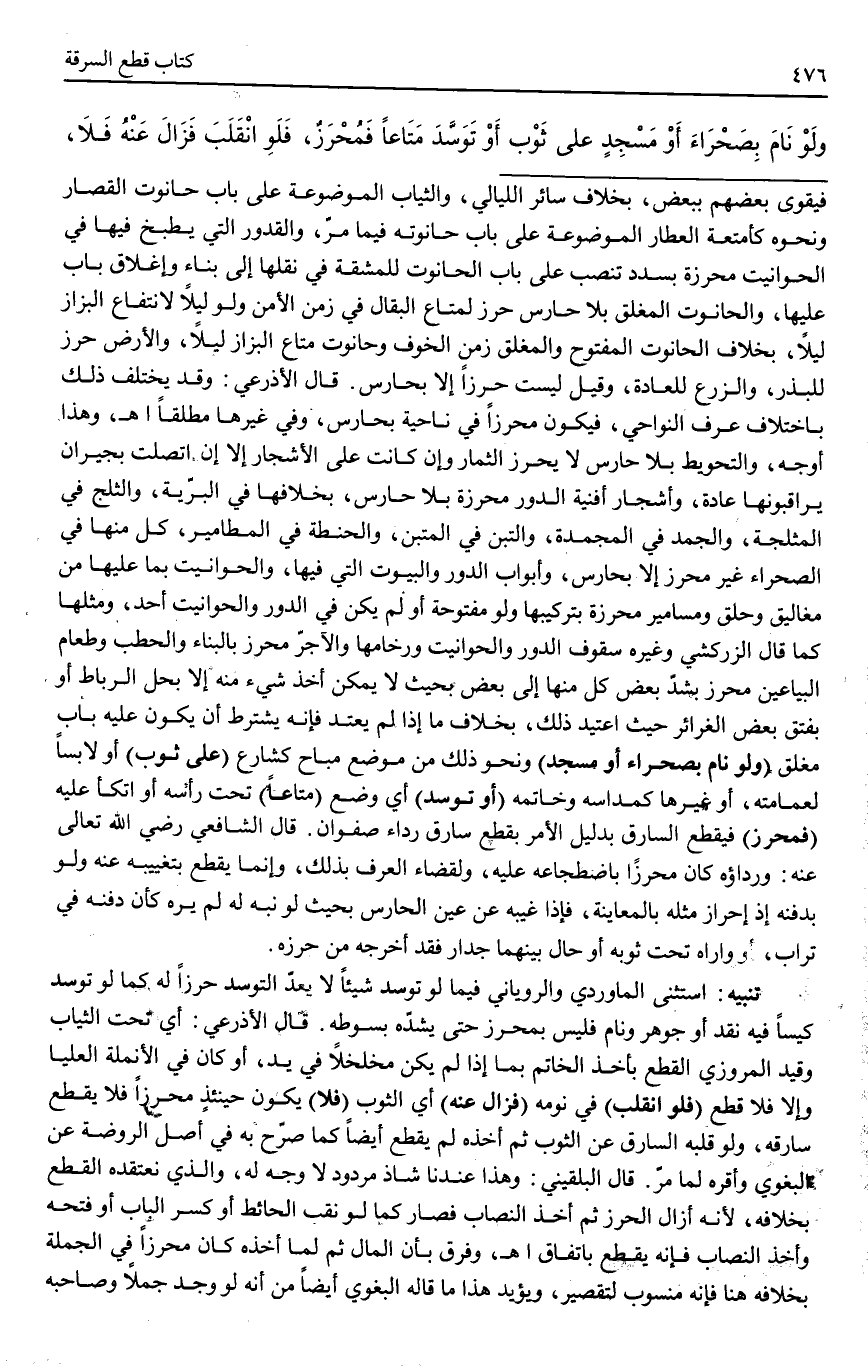 (وَلَوْ نَامَ بِصَحْرَاءَ أَوْ مَسْجِدٍ) وَنَحْوِ ذَلِكَ مِنْ مَوْضِعٍ مُبَاحٍ كَشَارِعٍ (عَلَى ثَوْبٍ) أَوْ لَابَسَا لَعِمَامَتِهِ، أَوْ غَيْرِهَا كَمَدَاسِهِ وَخَاتَمِهِ (أَوْ تَوَسَّدَ) أَيْ: وَضَعَ (مَتَاعًا) تَحْتَ رَأْسِهِ أَوْ اتَّكَأَ عَلَيْهِ (فَمُحْرَزٌ) فَيُقْطَعُ السَّارِقُ بِدَلِيلِ الْأَمْرِ بِقَطْعِ سَارِقِ رِدَاءِ صَفْوَانَ. قَالَ الشَّافِعِيُّ - رَضِيَ اللَّهُ تَعَالَى عَنْهُ -: وَرِدَاؤُهُ كَانَ مُحْرَزًا بِاضْطِجَاعِهِ عَلَيْهِ، وَلِقَضَاءِ الْعُرْفِ بِذَلِكَ، وَإِنَّمَا يُقْطَعُ بِتَغْيِيبِهِ عَنْهُ وَلَوْ بِدَفْنِهِ إذْ إحْرَازُ مِثْلِهِ بِالْمُعَايَنَةِ، فَإِذَا غَيَّبَهُ عَنْ عَيْنِ الْحَارِسِ بِحَيْثُ لَوْ نُبِّهَ لَهُ لَمْ يَرَهُ كَأَنْ دَفَنَهُ فِي تُرَابٍ، أَوْ وَارَاهُ تَحْتَ ثَوْبِهِ أَوْ حَالَ بَيْنَهُمَا جِدَارٌ فَقَدْ أَخْرَجَهُ مِنْ حِرْزِهِ.