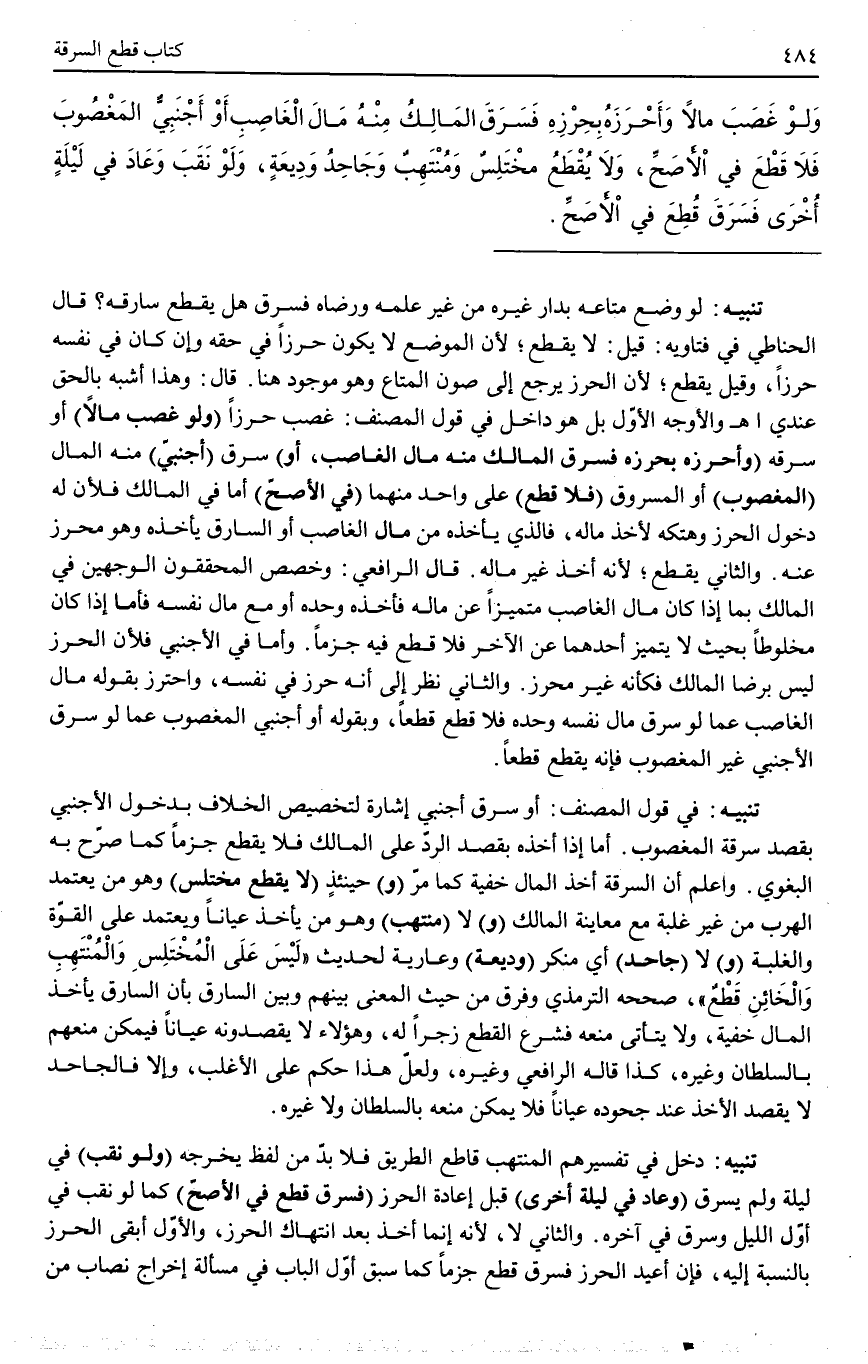 وَاعْلَمْ أَنَّ السَّرِقَةَ أَخْذُ الْمَالِ خُفْيَةً كَمَا مَرَّ (وَ) حِينَئِذٍ (لَا يُقْطَعُ مُخْتَلِسٌ) وَهُوَ مَنْ يَعْتَمِدُ الْهَرَبَ مِنْ غَيْرِ غَلَبَةٍ مَعَ مُعَايَنَةِ الْمَالِكِ (وَ) لَا (مُنْتَهِبٌ) وَهُوَ مَنْ يَأْخُذُ عَيَانًا وَيَعْتَمِدُ عَلَى الْقُوَّةِ وَالْغَلَبَةِ (وَ) لَا (جَاحِدٌ) أَيْ: مُنْكِرٌ (وَدِيعَةً) وَعَارِيَّةً لِحَدِيثِ «لَيْسَ عَلَى الْمُخْتَلِسِ وَالْمُنْتَهِبِ وَالْخَائِنِ قَطْعٌ» ، صَحَّحَهُ التِّرْمِذِيُّ وَفَرَّقَ مِنْ حَيْثُ الْمَعْنَى بَيْنَهُمْ وَبَيْنَ السَّارِقِ بِأَنَّ السَّارِقَ يَأْخُذُ الْمَالَ خُفْيَةً، وَلَا يَتَأَتَّى مَنْعُهُ فَشُرِعَ الْقَطْعُ زَجْرًا لَهُ، وَهَؤُلَاءِ لَا يَقْصِدُونَهُ عَيَانًا فَيُمْكِنُ مَنْعُهُمْ بِالسُّلْطَانِ وَغَيْرِهِ، كَذَا قَالَهُ الرَّافِعِيُّ وَغَيْرُهُ، وَلَعَلَّ هَذَا حُكْمٌ عَلَى الْأَغْلَبِ، وَإِلَّا فَالْجَاحِدُ لَا يَقْصِدُ الْأَخْذَ عِنْدَ جُحُودِهِ عَيَانًا فَلَا يُمْكِنُ مَنْعُهُ بِالسُّلْطَانِ وَلَا غَيْرِهِ.