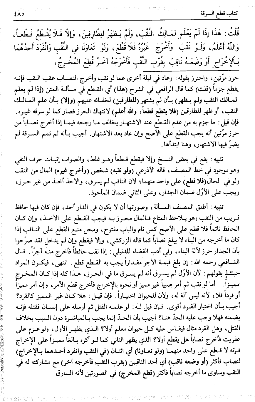 ـــــــــــــــــــــــــــــQحِرْزٍ مَرَّتَيْنِ، وَاحْتَرَزَ بِقَوْلِهِ: وَعَادَ فِي لَيْلَةٍ أُخْرَى عَمَّا لَوْ نَقَبَ وَأَخْرَجَ النِّصَابَ عَقِبَ النَّقْبِ فَإِنَّهُ يُقْطَعُ جَزْمًا (قُلْتُ) كَمَا قَالَ الرَّافِعِيُّ فِي الشَّرْحِ (هَذَا) أَيْ: الْقَطْعُ فِي مَسْأَلَةِ الْمَتْنِ (إذَا لَمْ يُعْلَمْ لِمَالِكِ النَّقْبِ وَلَمْ يَظْهَرْ) بِأَنْ لَمْ يَشْتَهِرْ (لِلطَّارِقِينَ) لِخَفَائِهِ عَلَيْهِمْ (وَإِلَّا) بِأَنْ عَلِمَ الْمَالِكُ النَّقْبَ، أَوْ ظَهَرَ لِلطَّارِقِينَ (فَلَا يُقْطَعُ قَطْعًا، وَاَللَّهُ أَعْلَمُ) لِانْتِهَاكِ الْحِرْزِ فَصَارَ كَمَا لَوْ سَرَقَهُ غَيْرُهُ. فَإِنْ قِيلَ: مَا جُزِمَ بِهِ مِنْ عَدَمِ الْقَطْعِ عِنْدَ الِاشْتِهَارِ يُخَالِفُ مَا رَجَّحَهُ فِيمَا إذَا أَخْرَجَ نِصَابًا مِنْ حِرْزٍ مَرَّتَيْنِ أَنَّهُ يَجِبُ الْقَطْعُ عَلَى الْأَصَحِّ وَإِنْ عَادَ بَعْدَ الِاشْتِهَارِ.